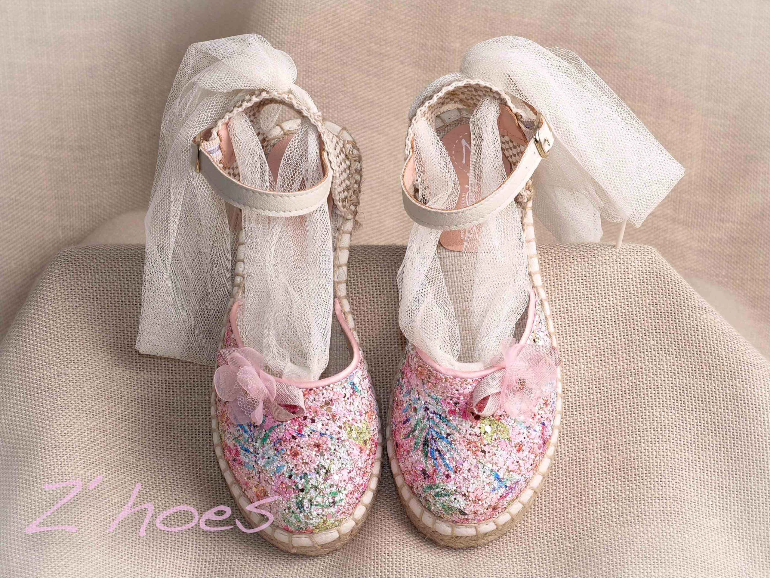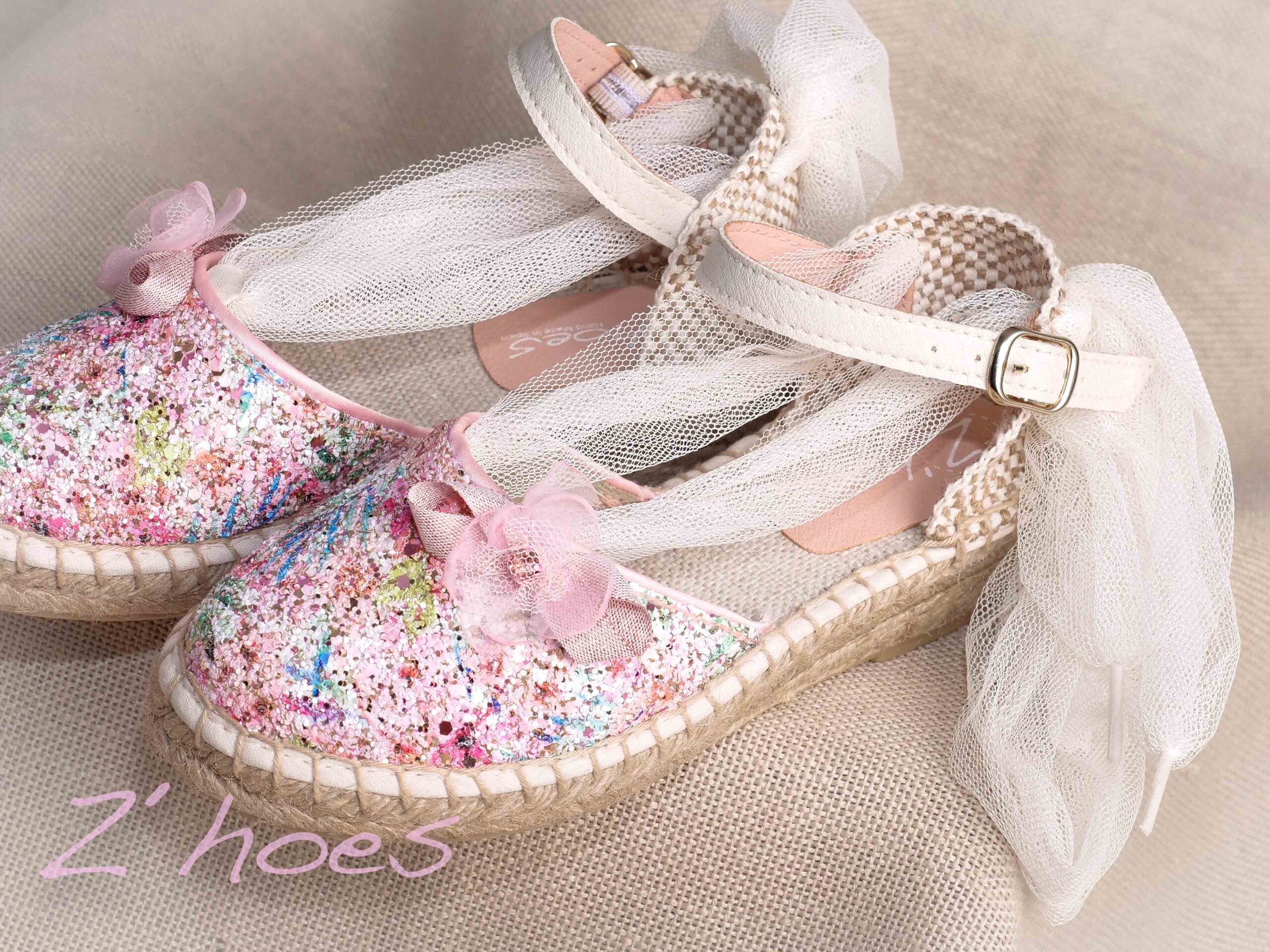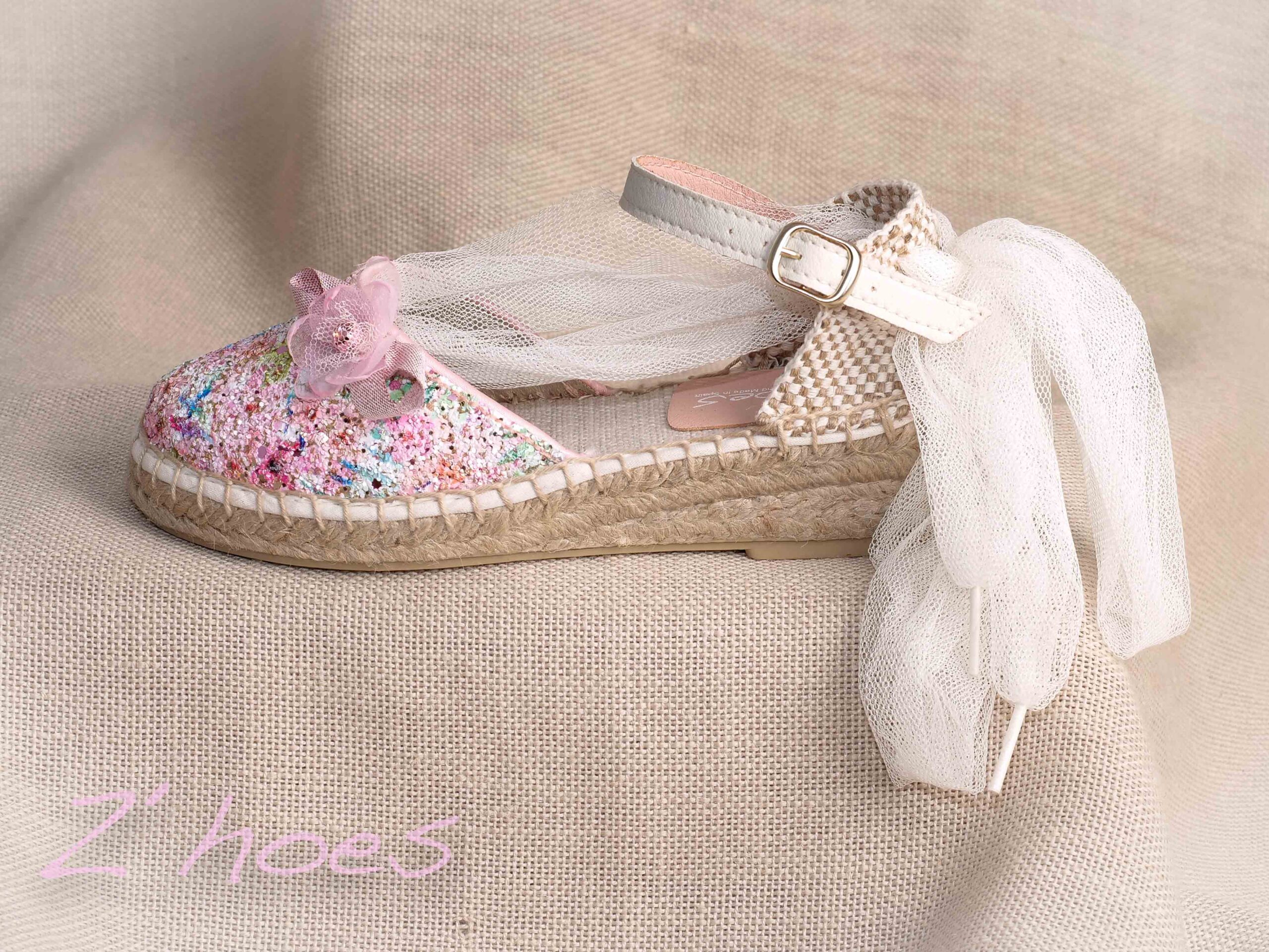 Alpargatas de comunión con base de yute, parte superior decorada con glitter multicolor, detalles de tul en forma de lazo trasero y flor frontal en tono rosa. Cierre ajustable con hebilla metálica para un ajuste seguro y cómodo.