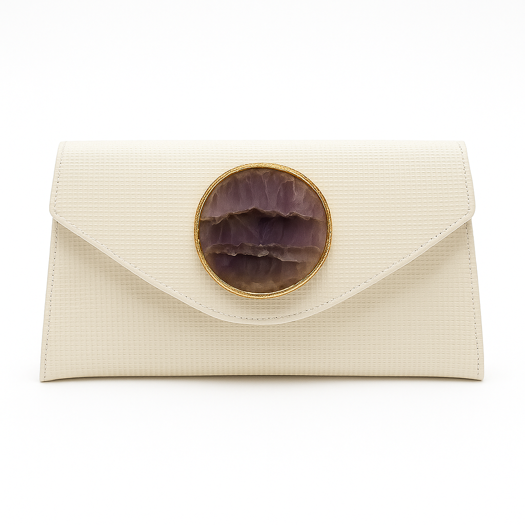 Clutch de rafia en tono blanco roto con solapa frontal. Detalle central en piedra amatista morada con borde dorado.