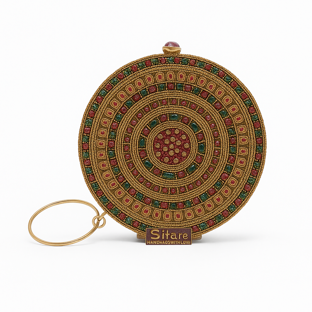 Clutch circular rígido con diseño artesanal en pedrería de tonos dorados, burdeos y verdes. Cierre de boquilla superior con piedra decorativa y asa tipo pulsera dorada. Acabado de gran detalle firmado por Sitare, ideal para estilismos de fiesta con toques étnicos y sofisticados.