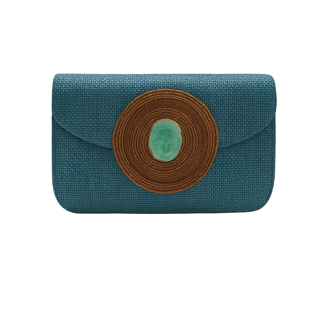 Clutch artesanal en tono turquesa con piedra natural central. Elegante y sofisticado, ideal para invitadas o eventos especiales. Fabricado en rafia trenzada con detalle bordado y piedra verde agua.