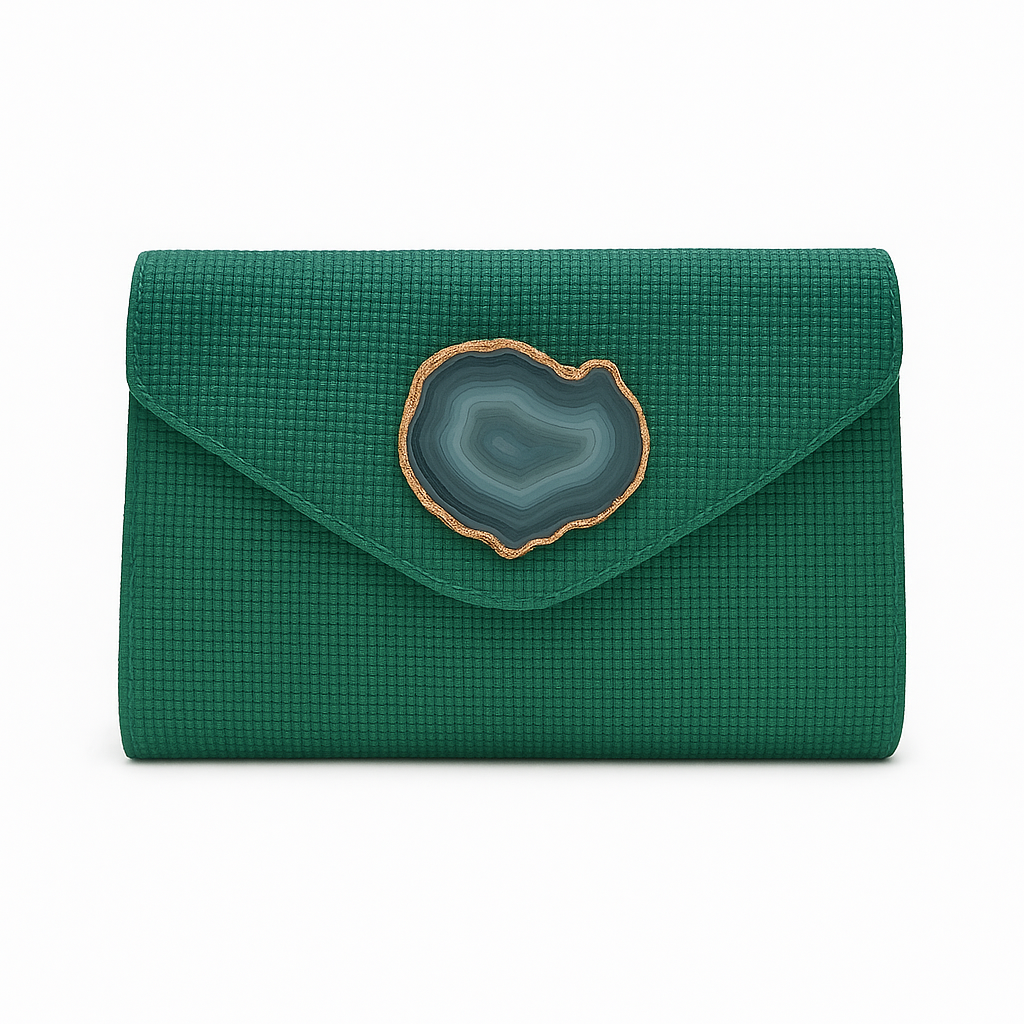 Clutch artesanal en rafia verde con solapa en pico. Detalle central de piedra ágata gris enmarcada en dorado. Diseño elegante y versátil para eventos.