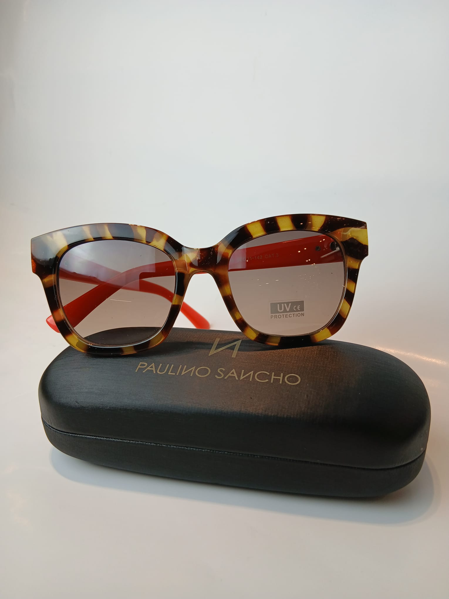 Montura de acetato estilo carey con diseño angulado y varillas en contraste rojo coral. Lentes marrones que combinan estética llamativa y protección visual.
