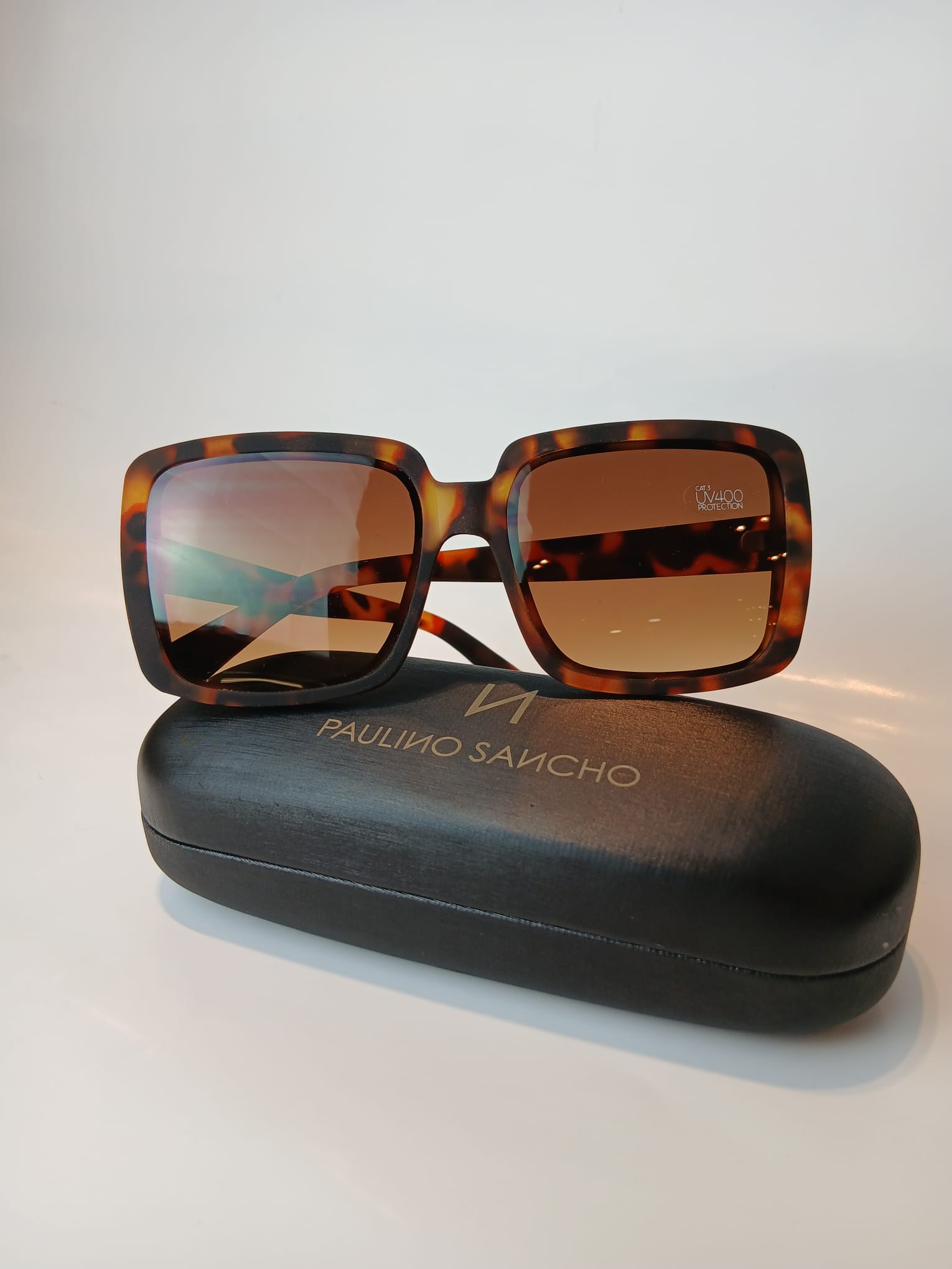 Montura en acetato efecto carey con diseño cuadrado de líneas marcadas. Lentes marrones con degradado suave.