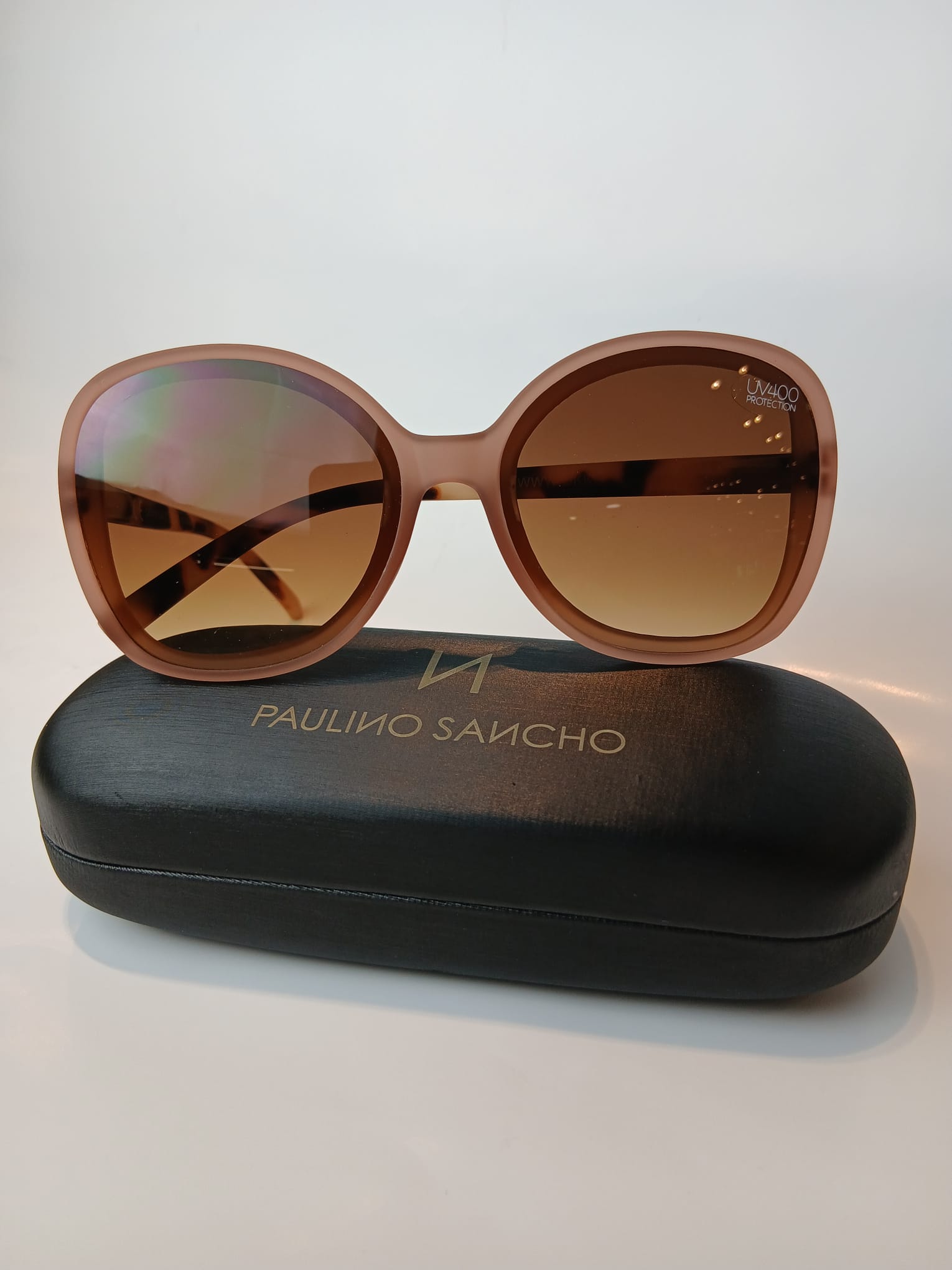 Montura de acetato en tono nude mate con diseño redondeado y elegante. Lentes marrones con degradado suave.
