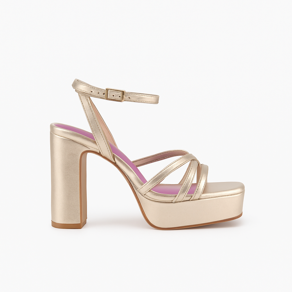 Sandalia de plataforma con tacón ancho alto en acabado metalizado dorado. Diseño de tiras finas cruzadas en el empeine. Cierre de pulsera con hebilla.
