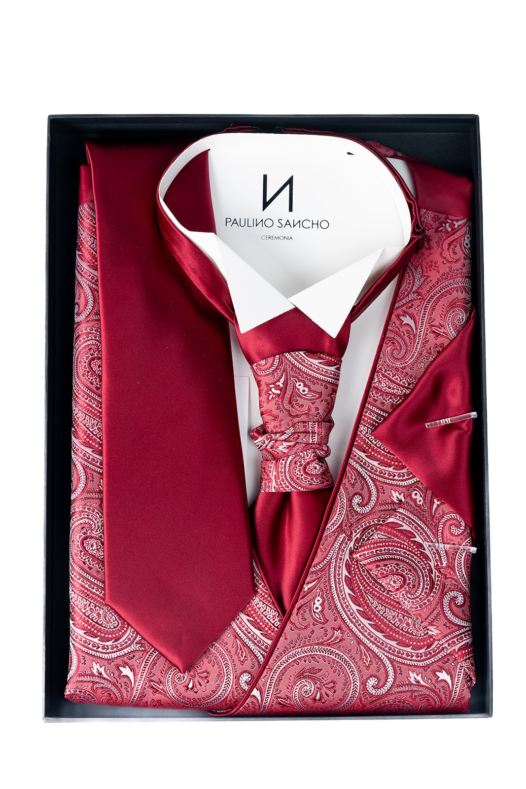 Pack de 4 piezas, compuesto por chaleco, corbata, corbatón y pañuelo.