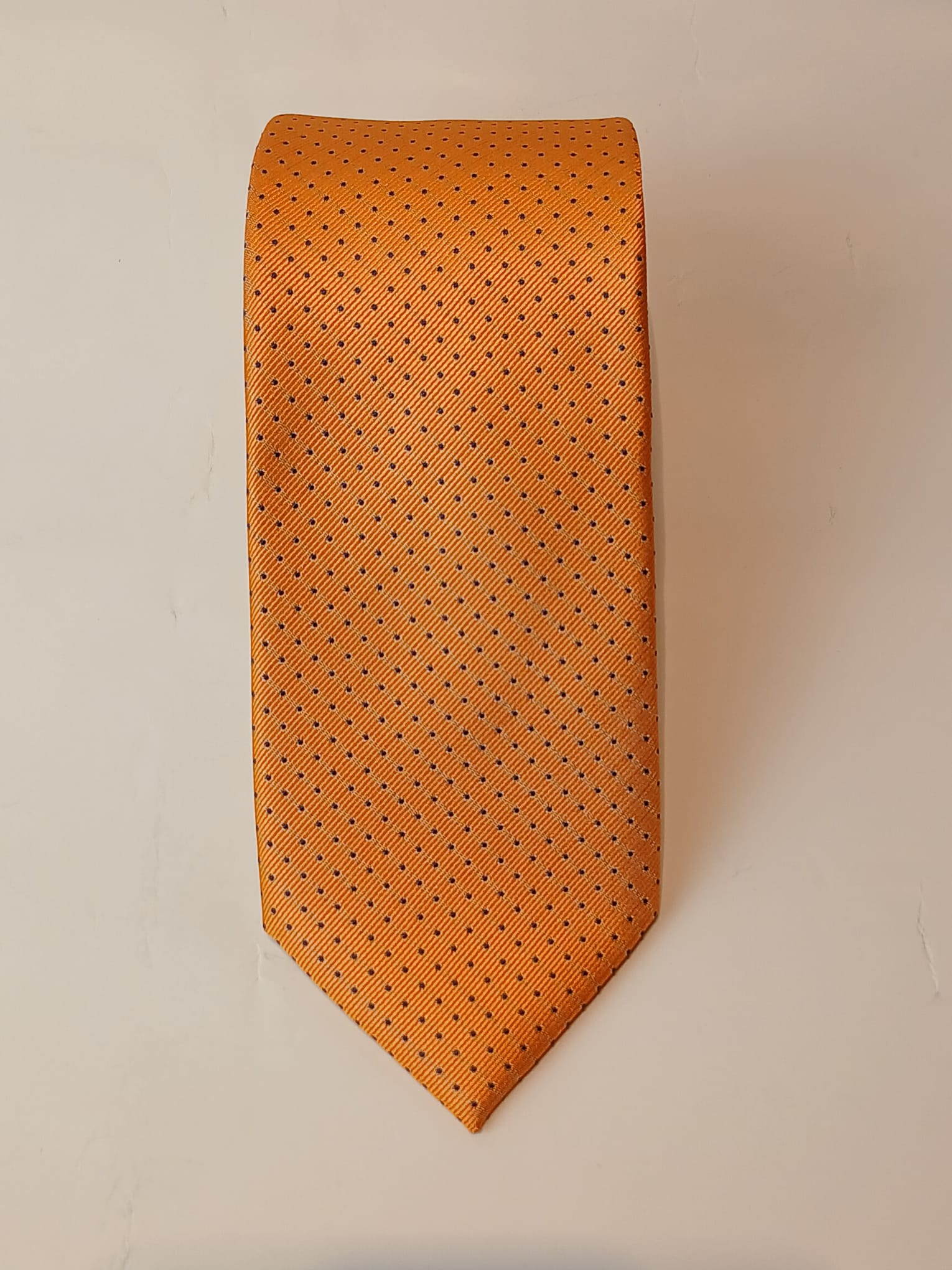 Corbata confeccionada en seda satinada de tono naranja vibrante, con microestampado de topos alineados en azul marino.