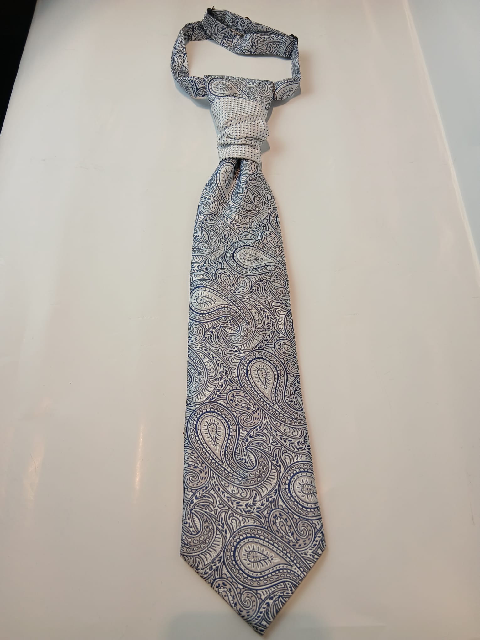 Corbata tipo ascot en blanco y azul con dibujo paisley