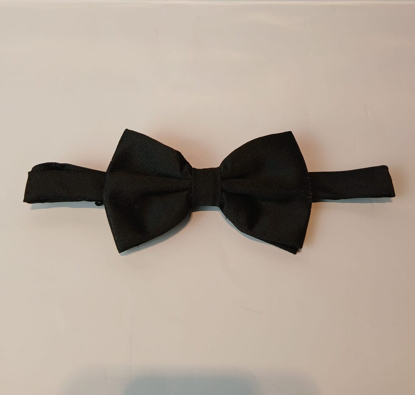 Pajarita negra lisa, con un acabado satinado discreto y elegante. Ideal para esmóquines, galas o bodas formales.