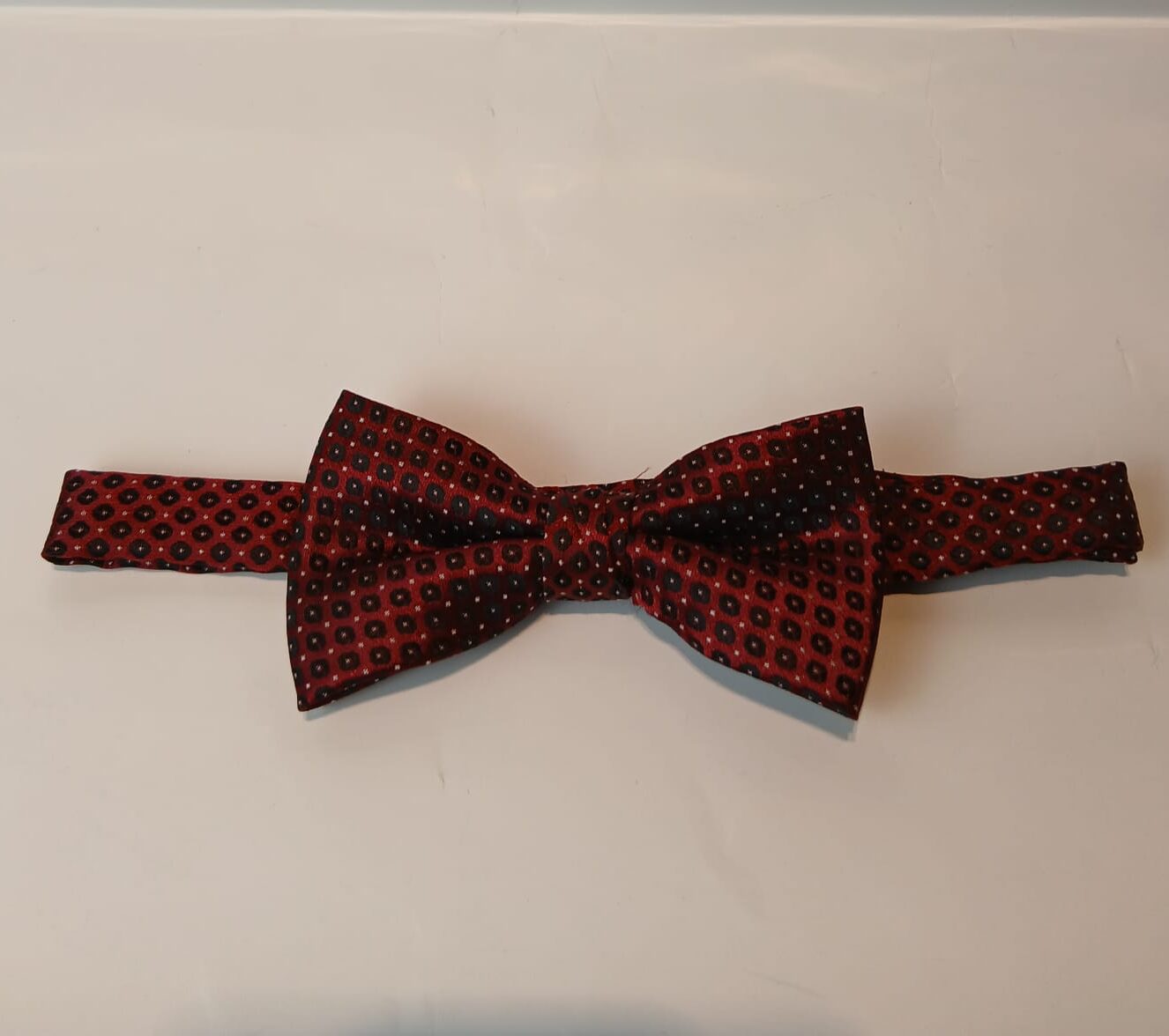 Esta pajarita en rojo intenso presenta un microestampado geométrico en negro, logrando un equilibrio perfecto entre elegancia tradicional y modernidad.