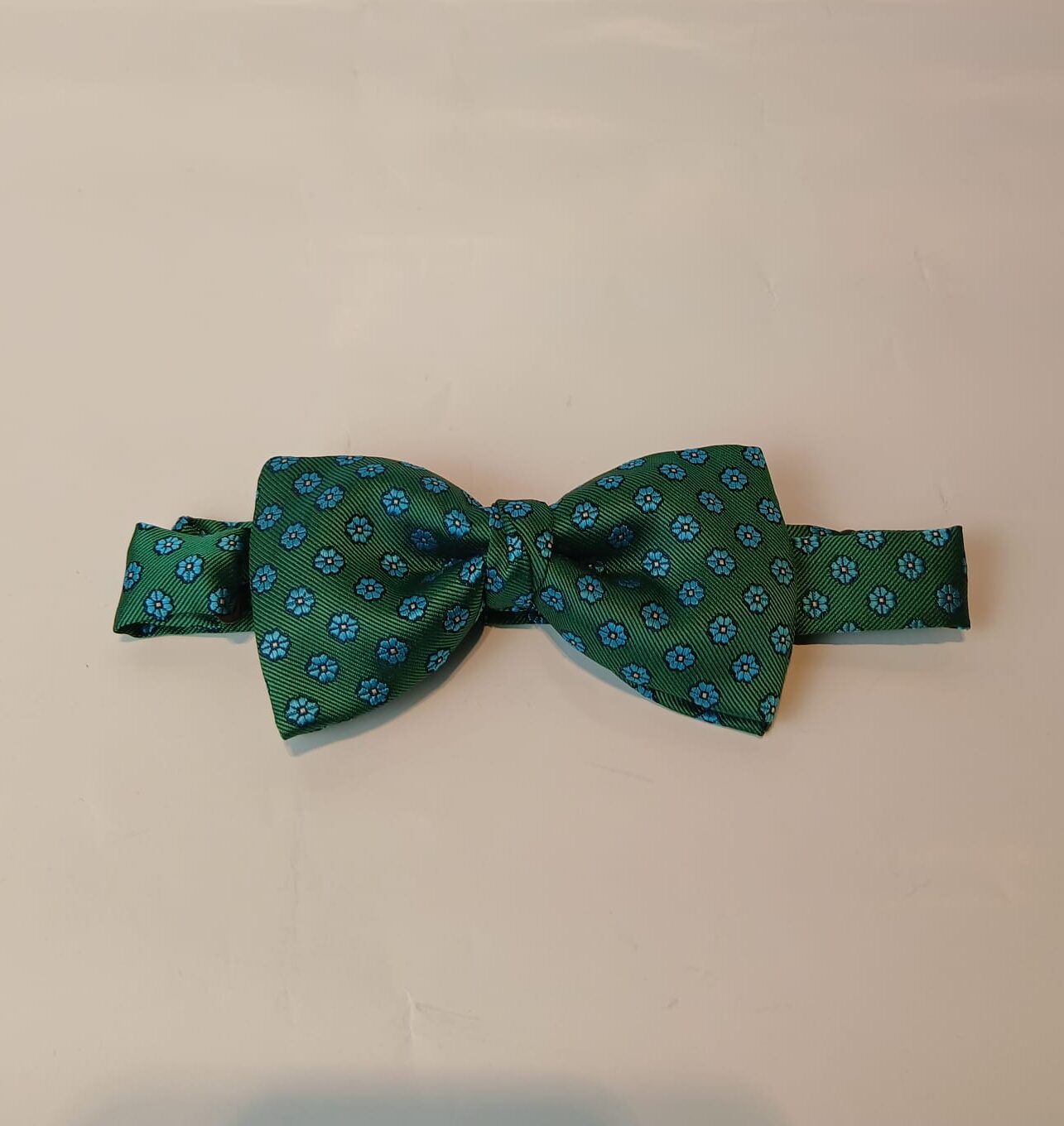 Pajarita de fondo verde con un sutil estampado de pequeñas flores en azul celeste. Un complemento con personalidad, perfecto para bodas de día