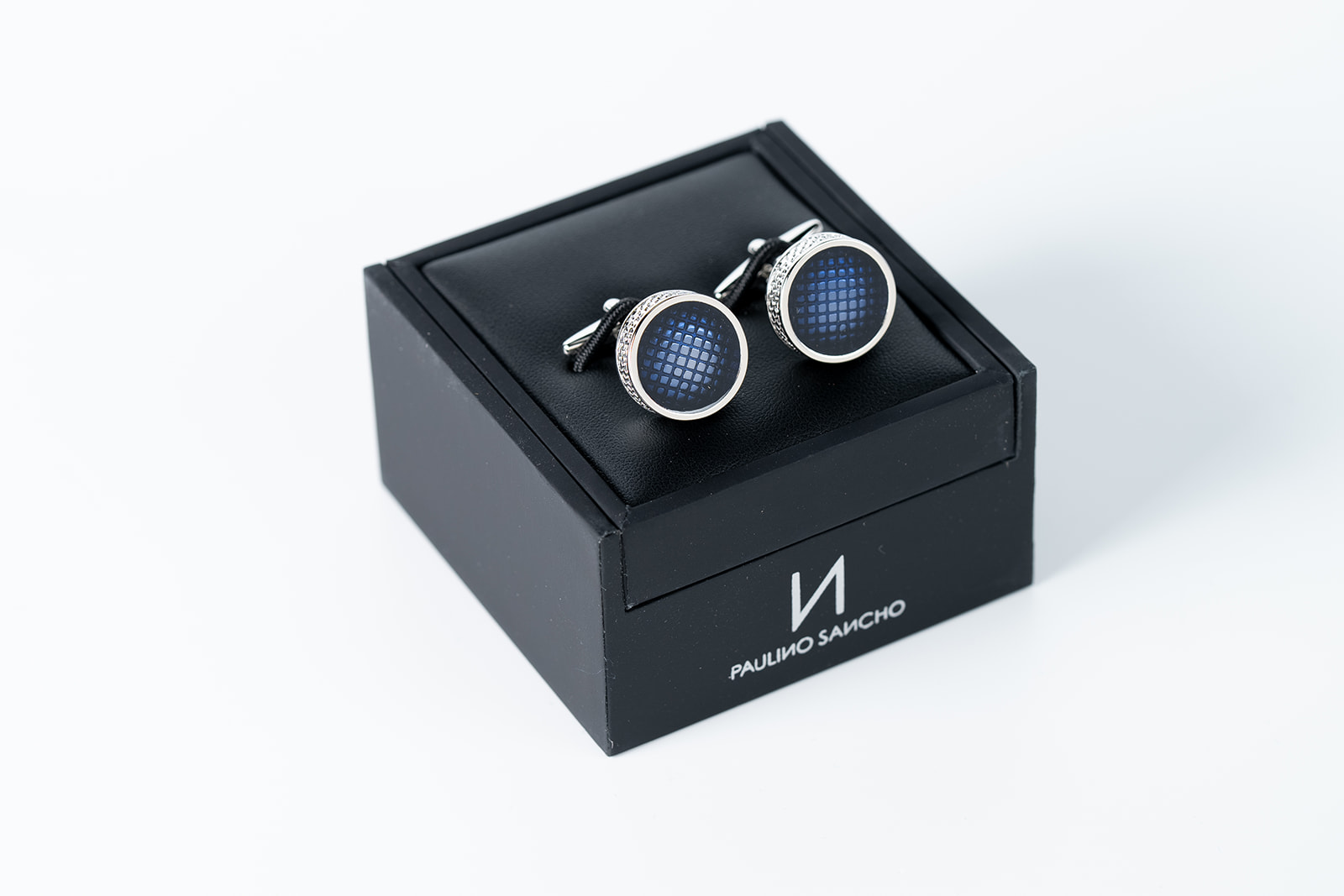 Diseño de forma redonda, con un efecto que simula la piel de serpiente en un color azulado y combinado con plata.