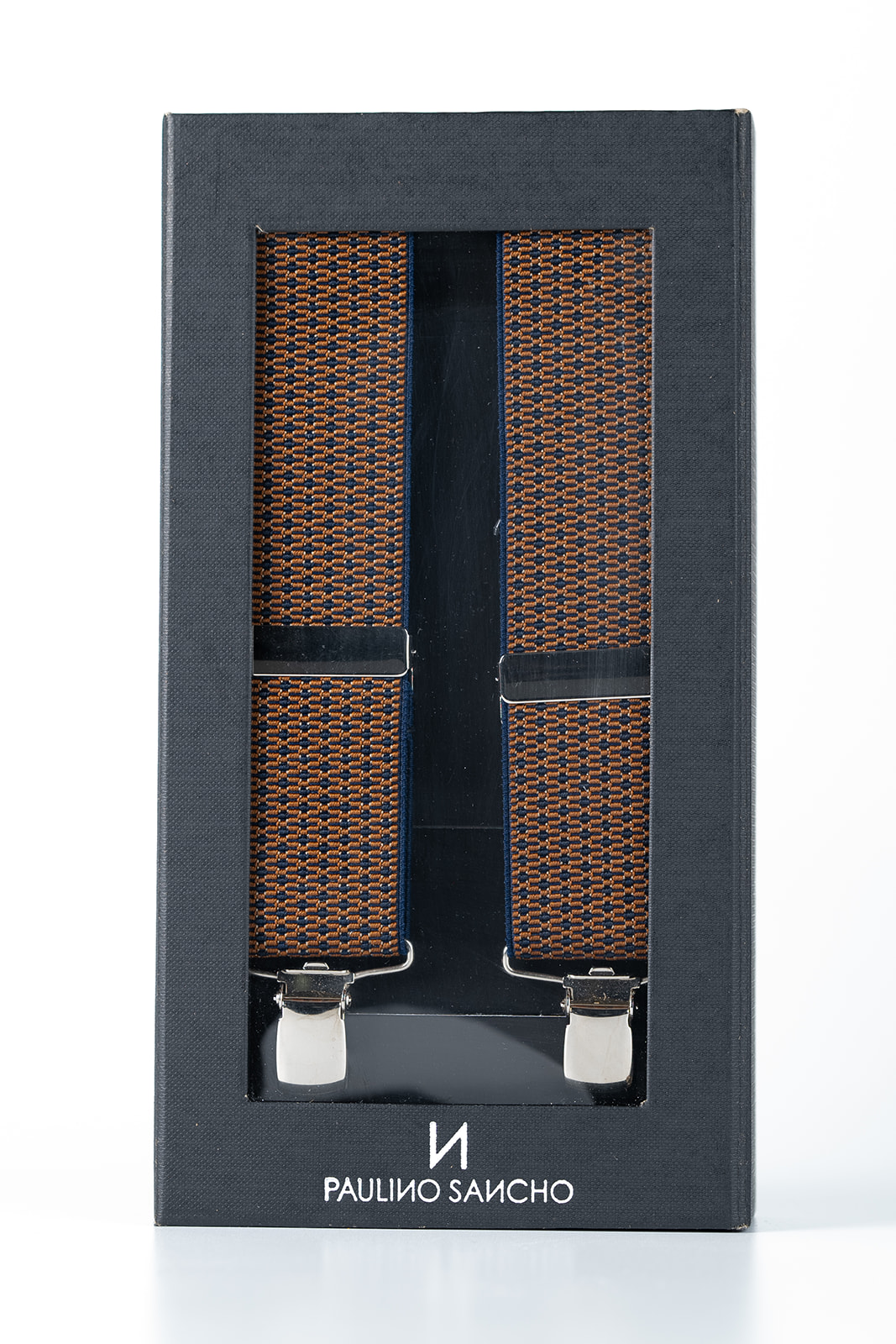 Tirantes de click con opción a cambiar el cierre por botón cosido, con un estampado en colores marrón combinado con azul marino.