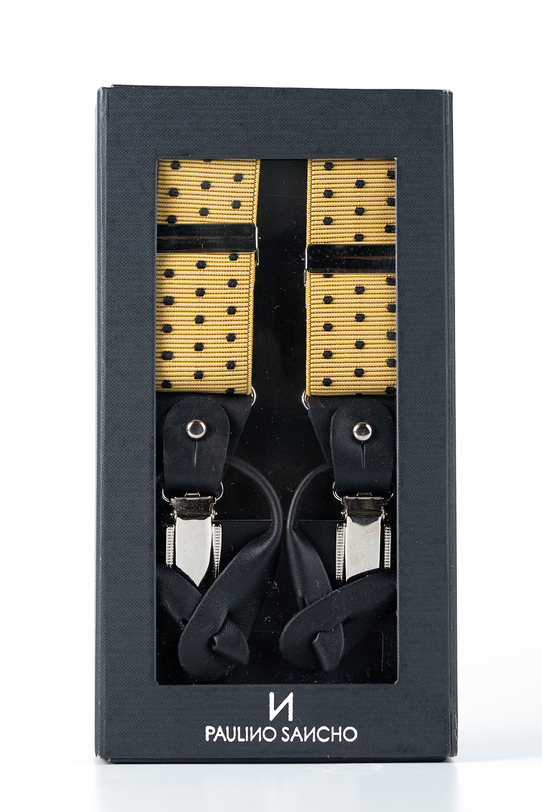 Tirantes de click con opción a cambiar el cierre por botón cosido, con un estampado de topos en colores marrones combinado con el mostaza.