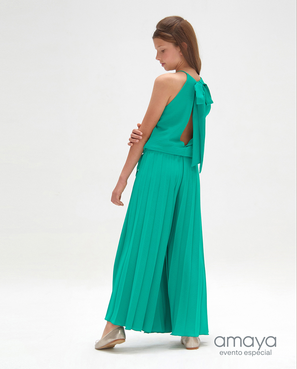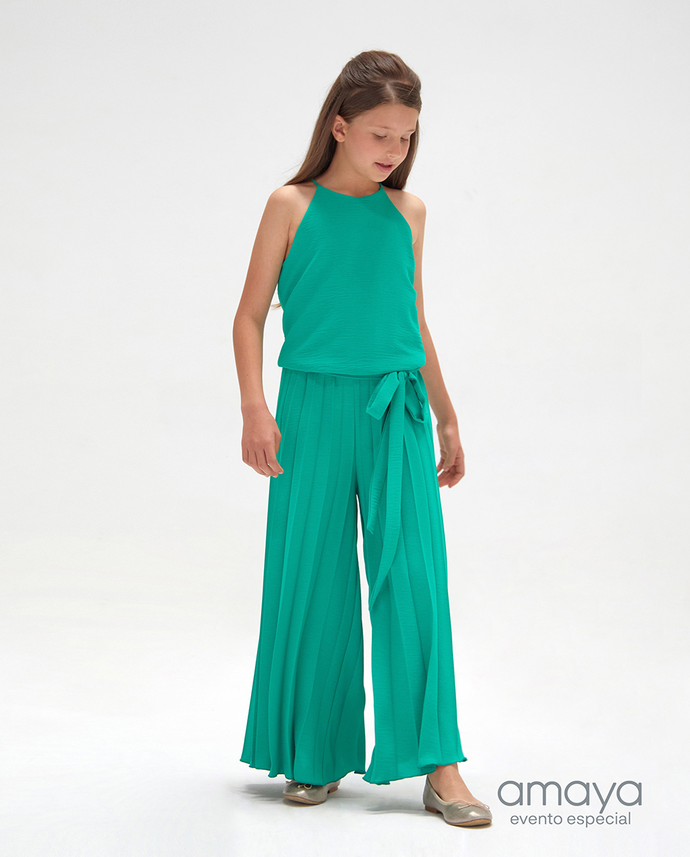 Mono en tirantes, cuello redondo, con pantalón de camal ancho plisado, espalda cruzada.