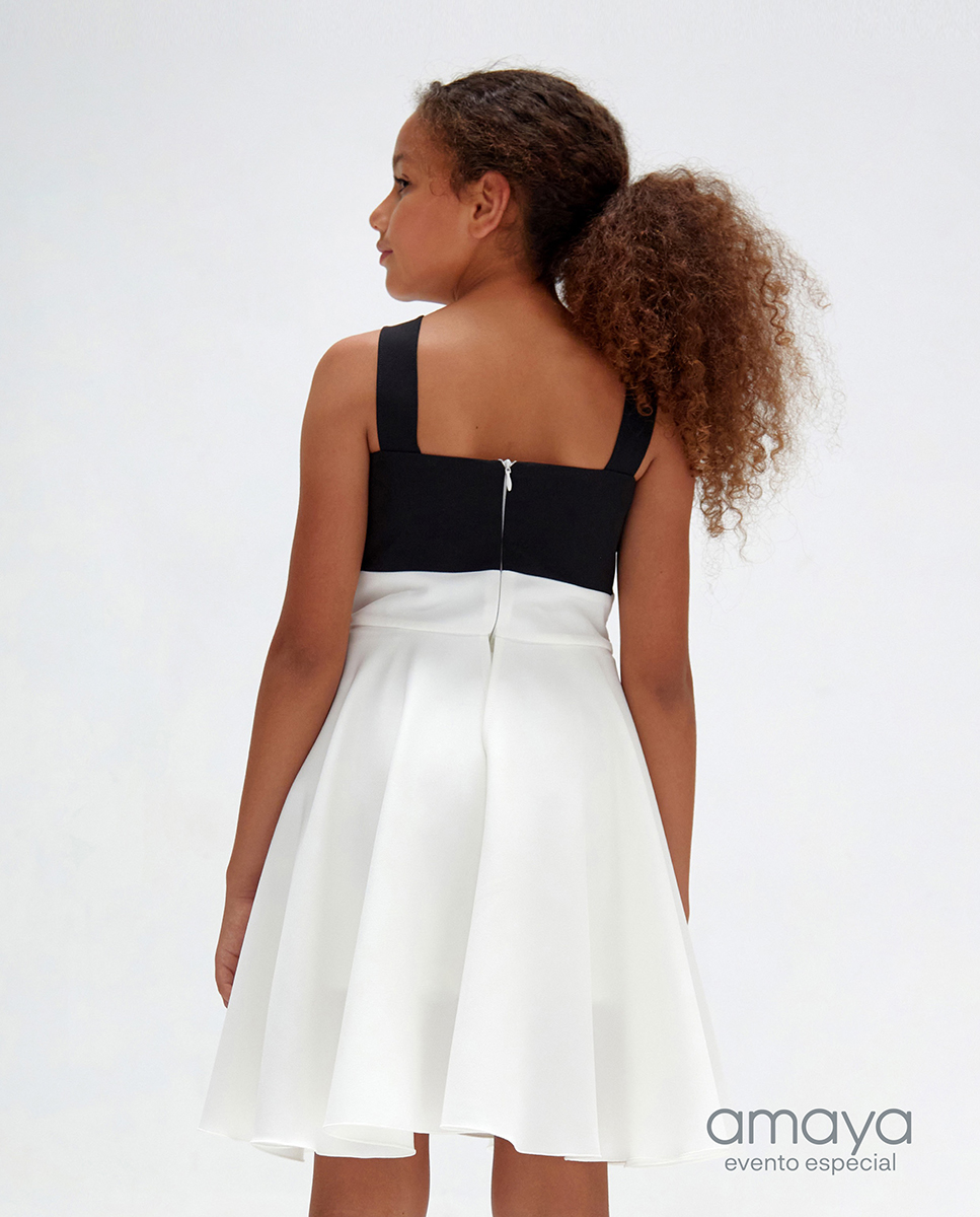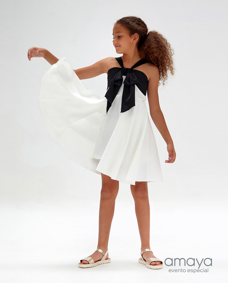 Lazada en el pecho, combinando el blanco y negro, escote cogido al cuello con tirantes.
