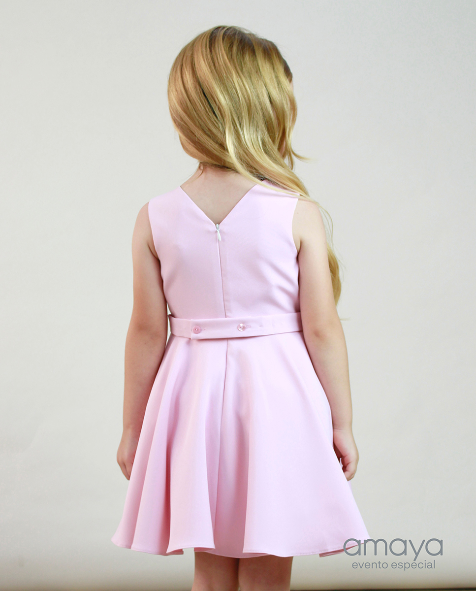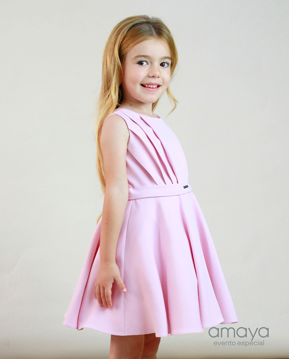 Escote en forma redonda y cerrada, tirante ancho y con un detalle en plisado y falda de tablas.