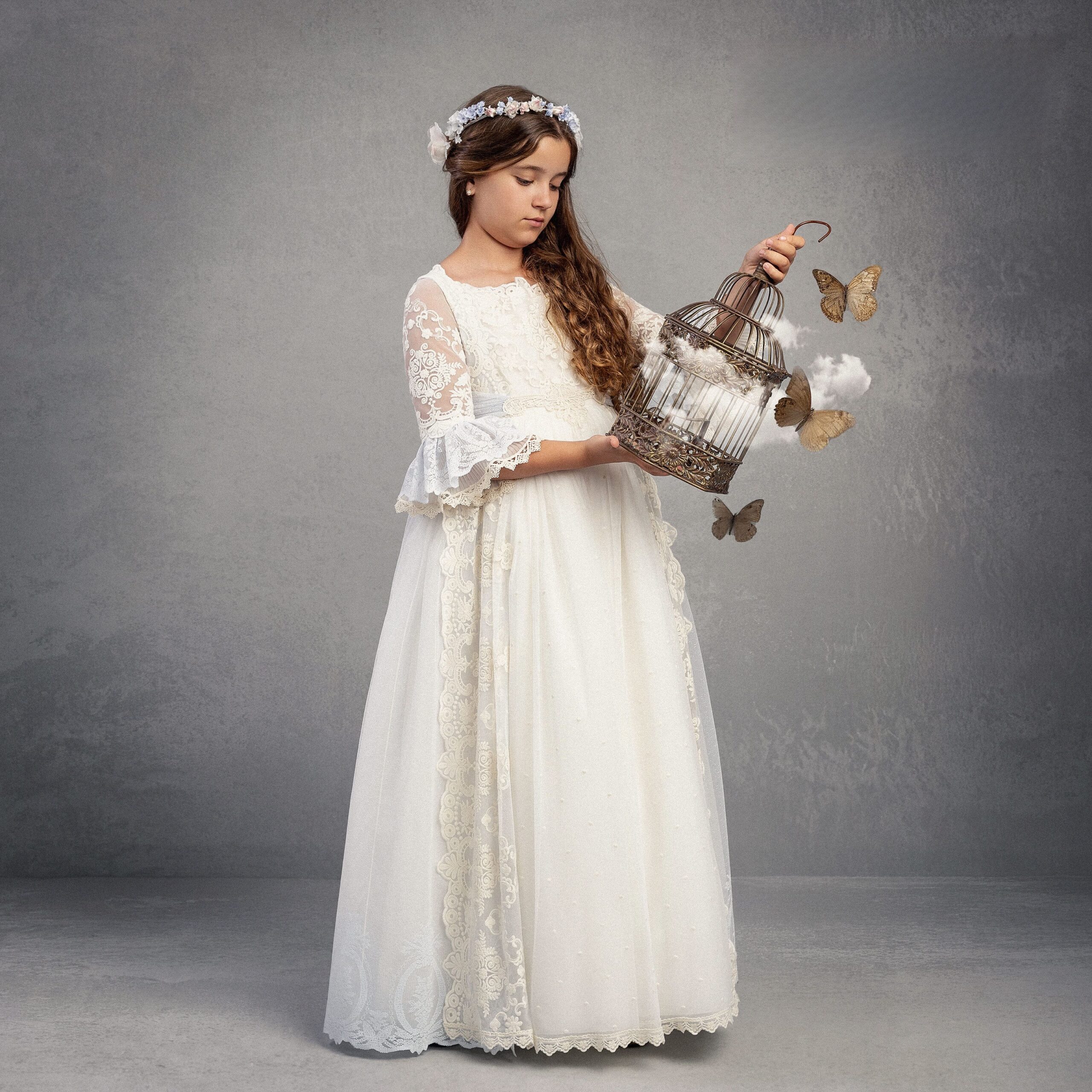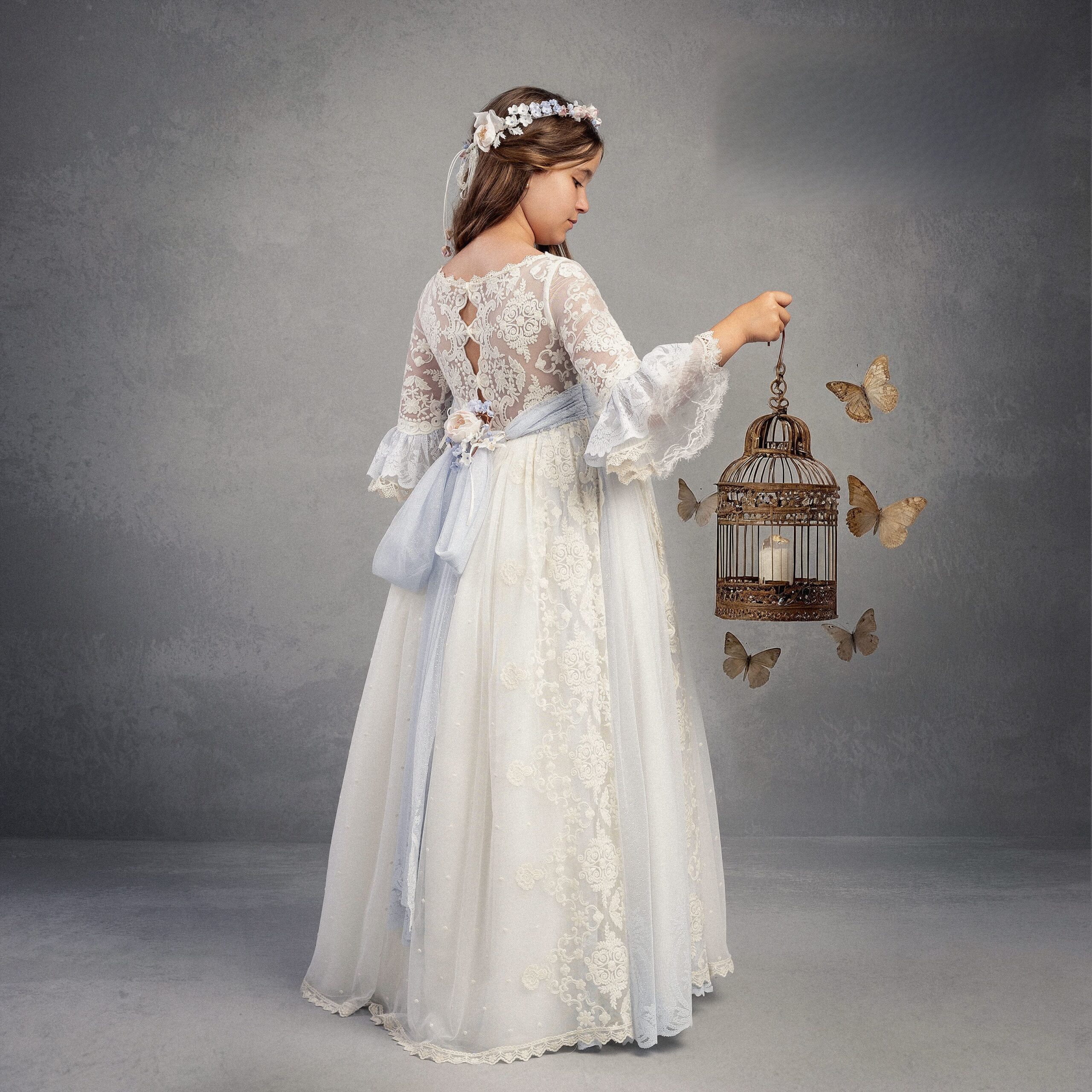 Vestido de comunión en tul con encaje floral, mangas tres cuartos acampanadas y sobrecapa bordada con caída elegante.