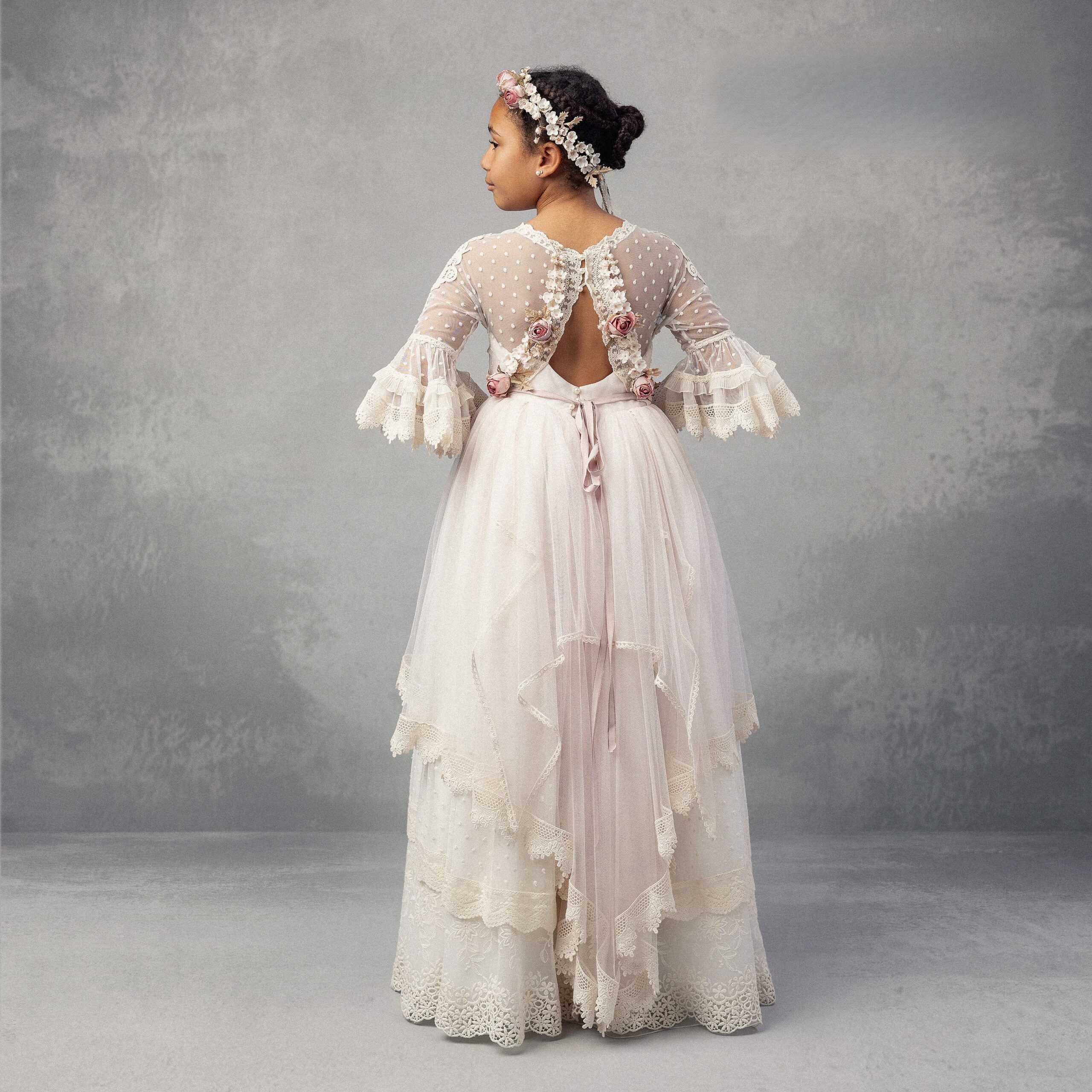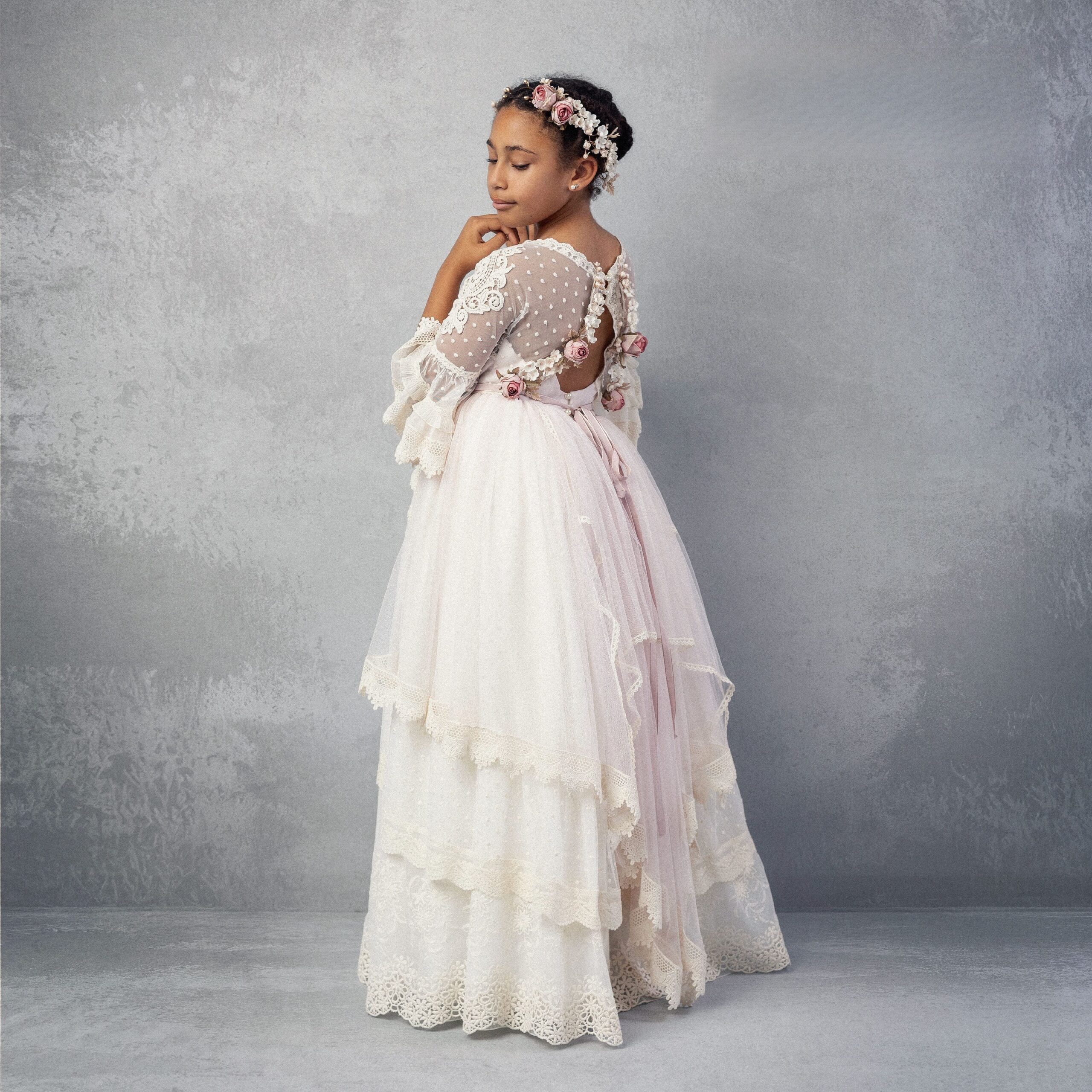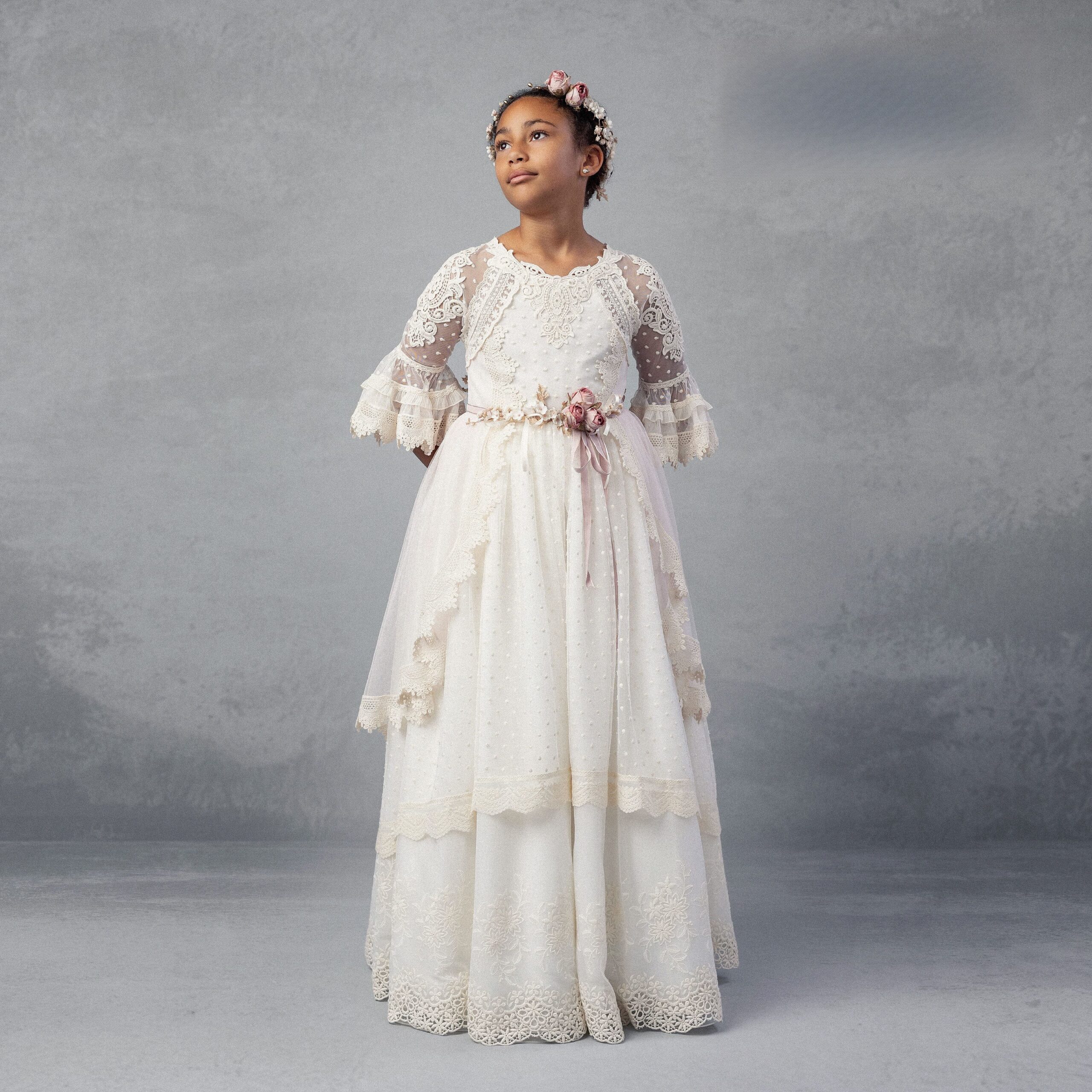 Vestido de comunión romántico con mangas de encaje, sobrecapa asimétrica, cinturón floral en tonos rosa y falda bordada.