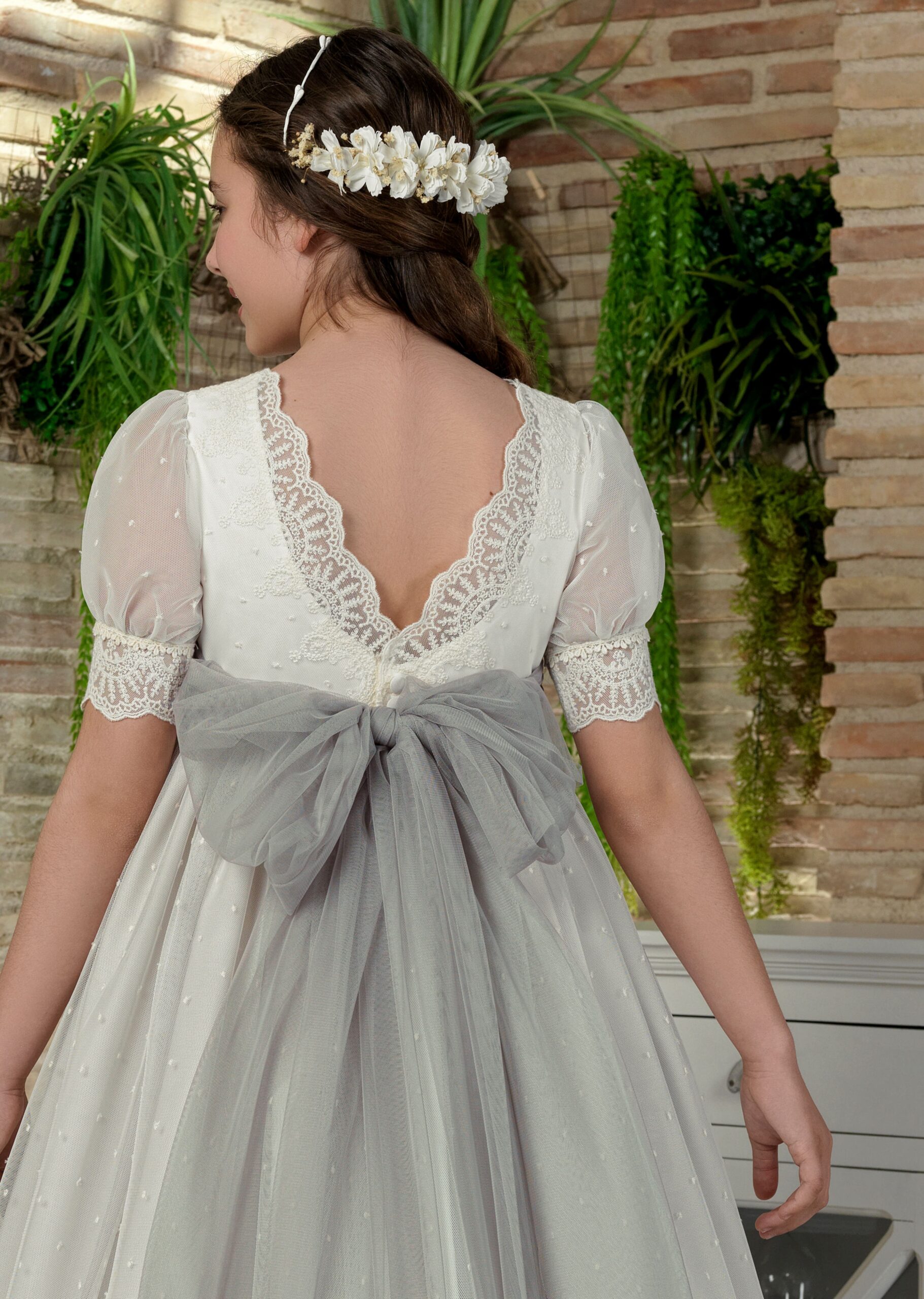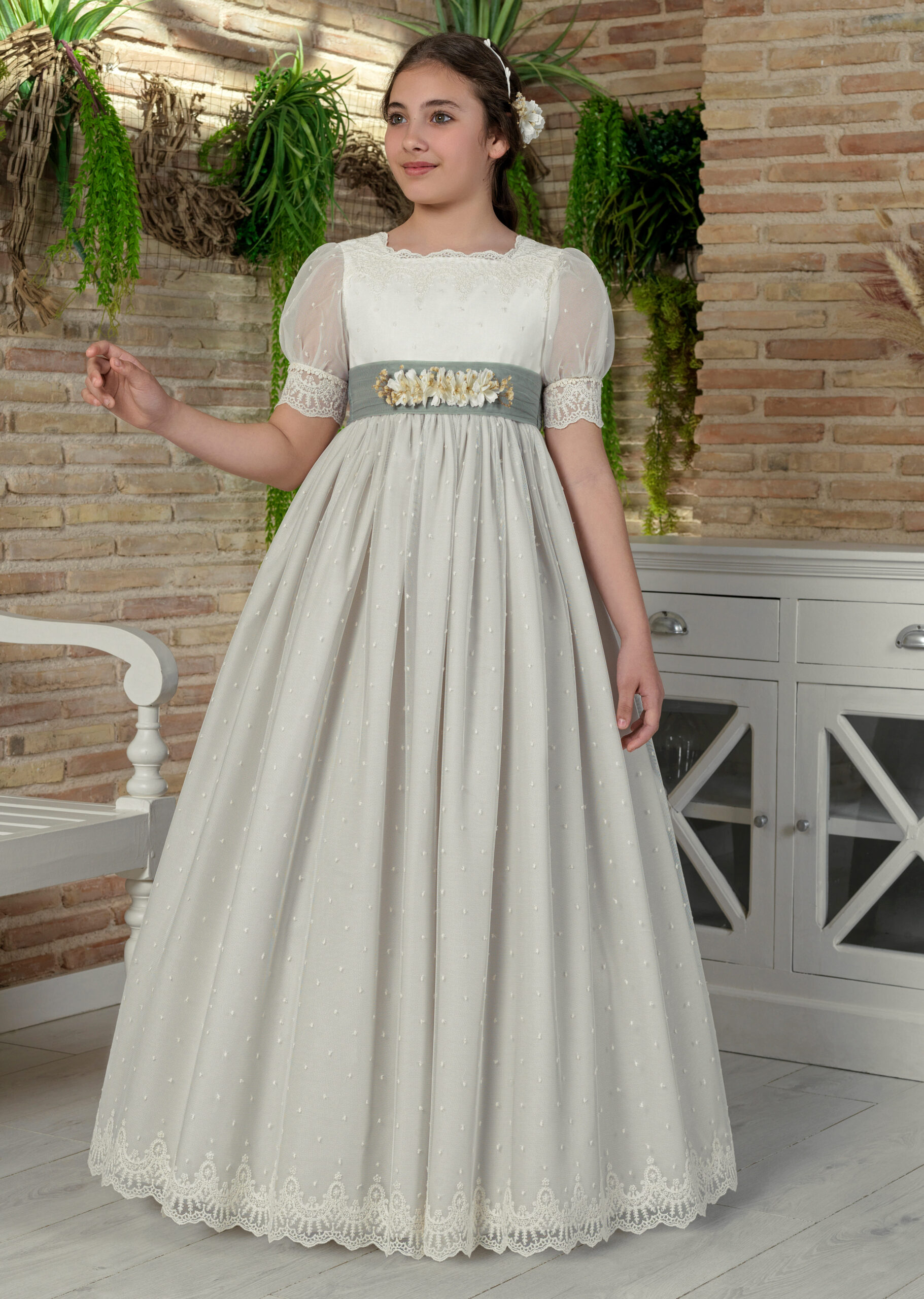 Vestido de comunión en tono natural con cinturón verde decorado con flores, mangas cortas abullonadas y falda de tul bordado.