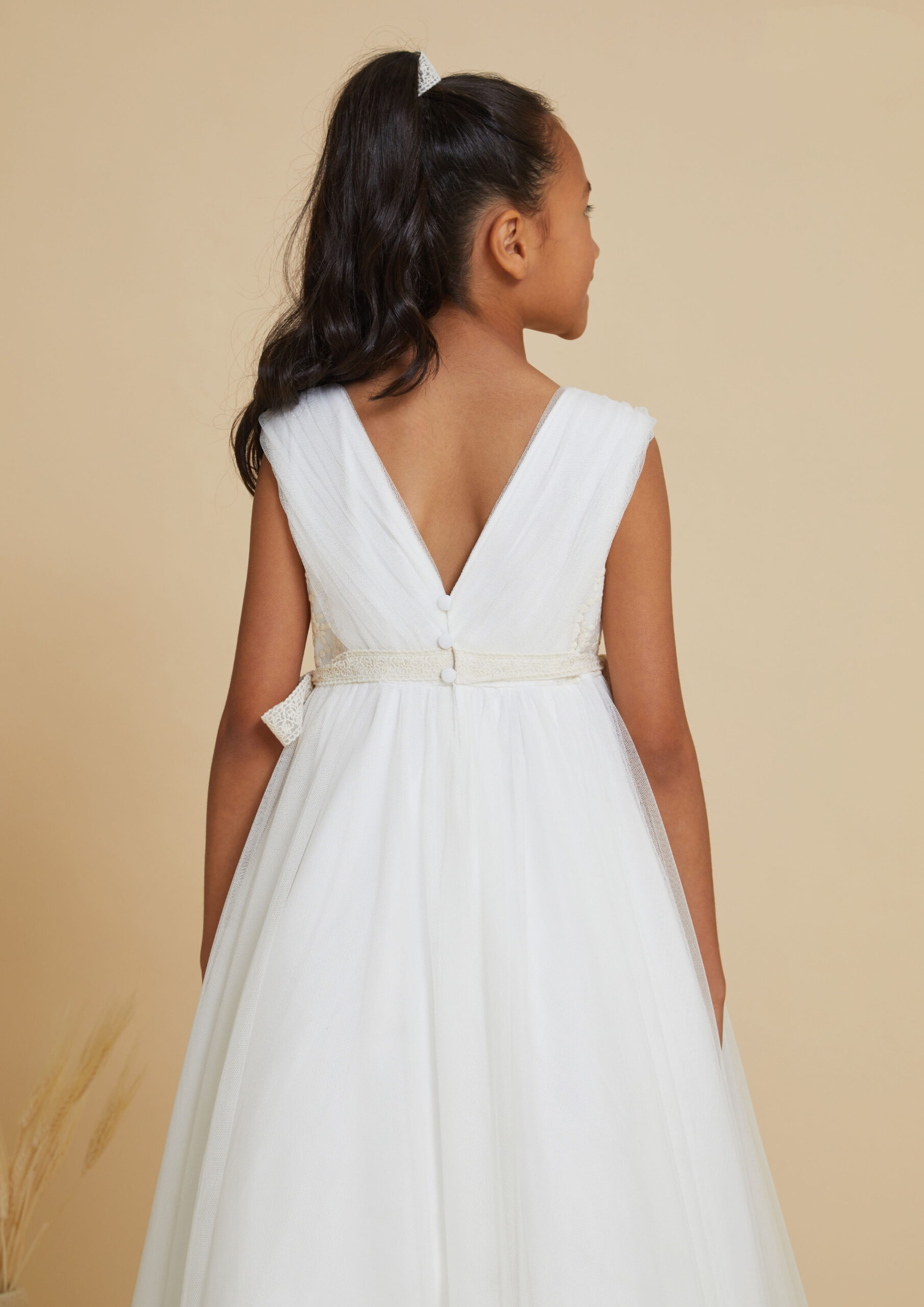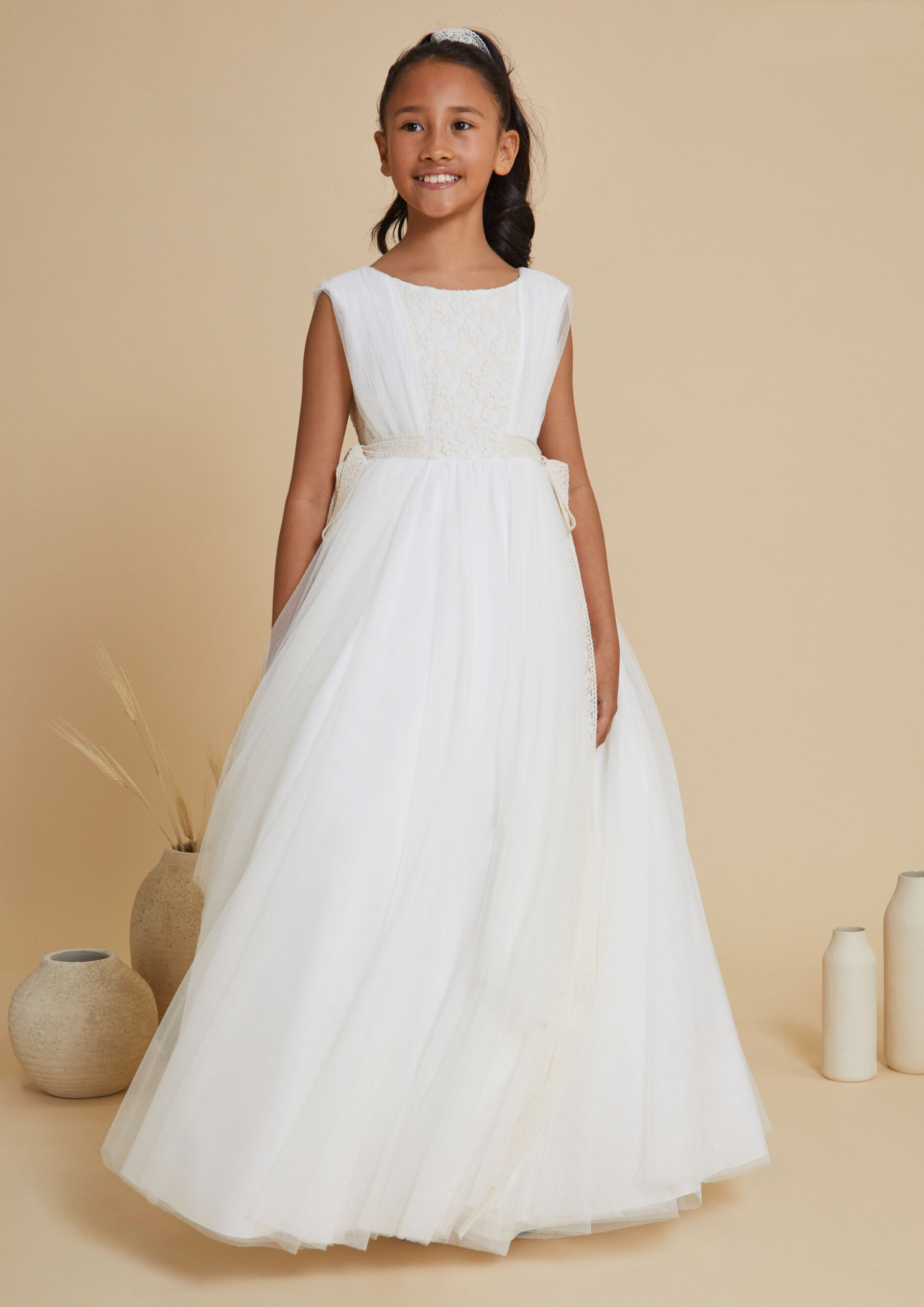 Vestido de comunión sin mangas, con detalles de encaje en el corpiño y falda amplia de tul, creando un estilo elegante y fluido.