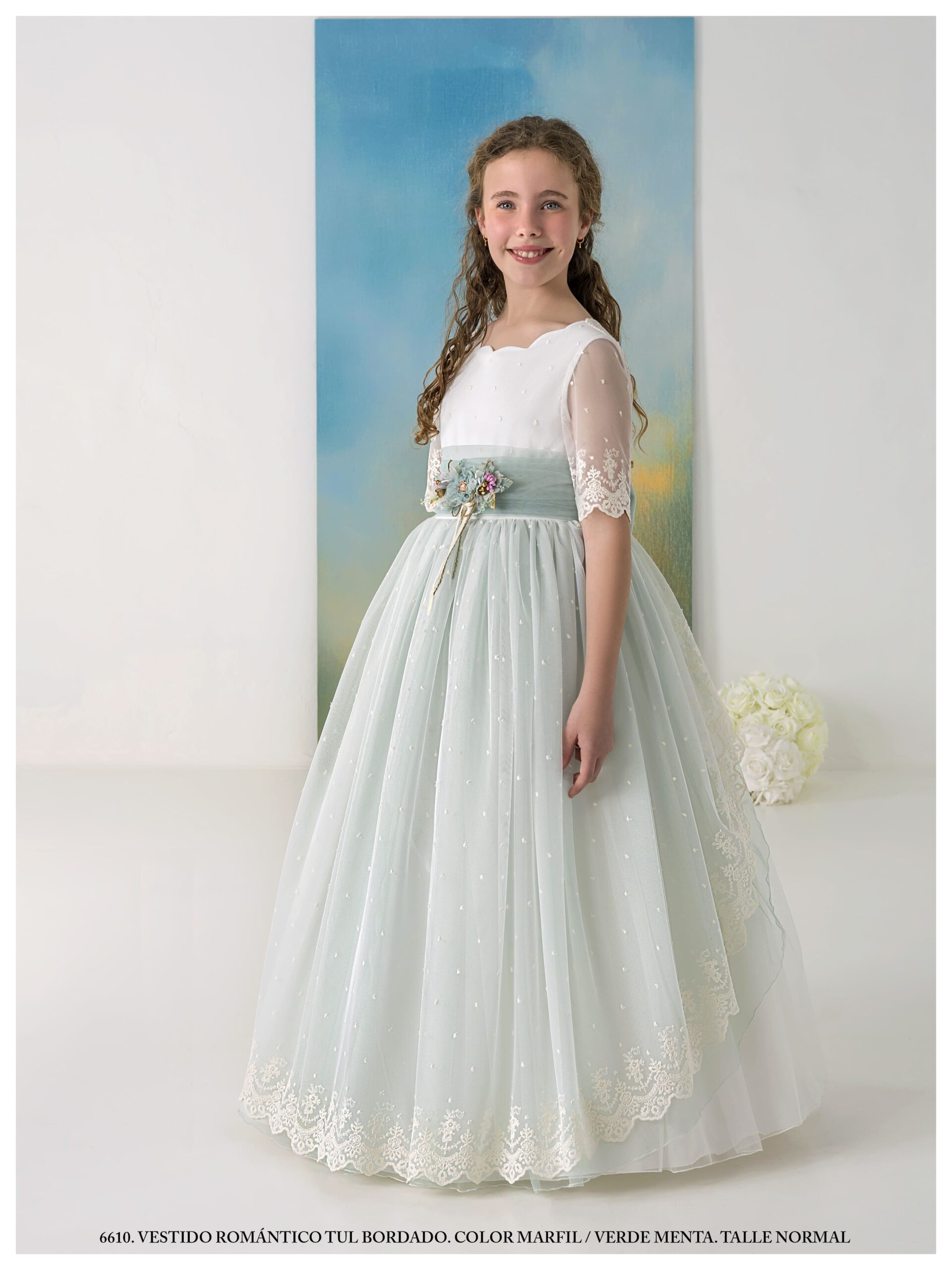 Vestido romántico en tul bordado color marfil y verde menta, con mangas transparentes y cinturón floral.