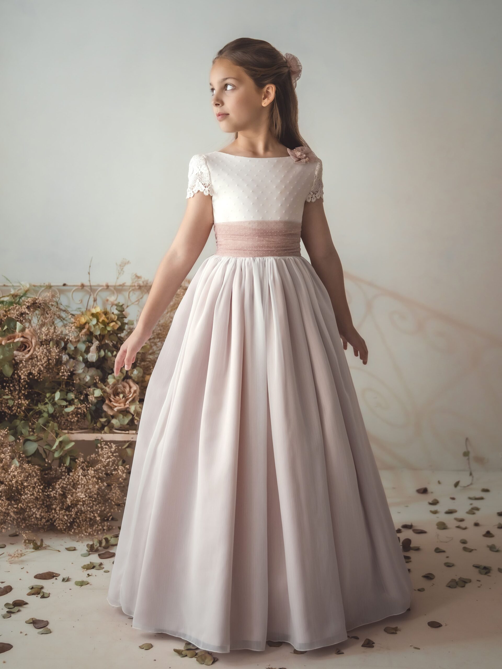 Vestido de comunión de estilo delicado y romántico, con cuerpo en plumeti y mangas cortas de encaje. Su falda en tono rosa empolvado aporta originalidad y elegancia, mientras que el cinturón a juego con detalle floral resalta la dulzura del conjunto.