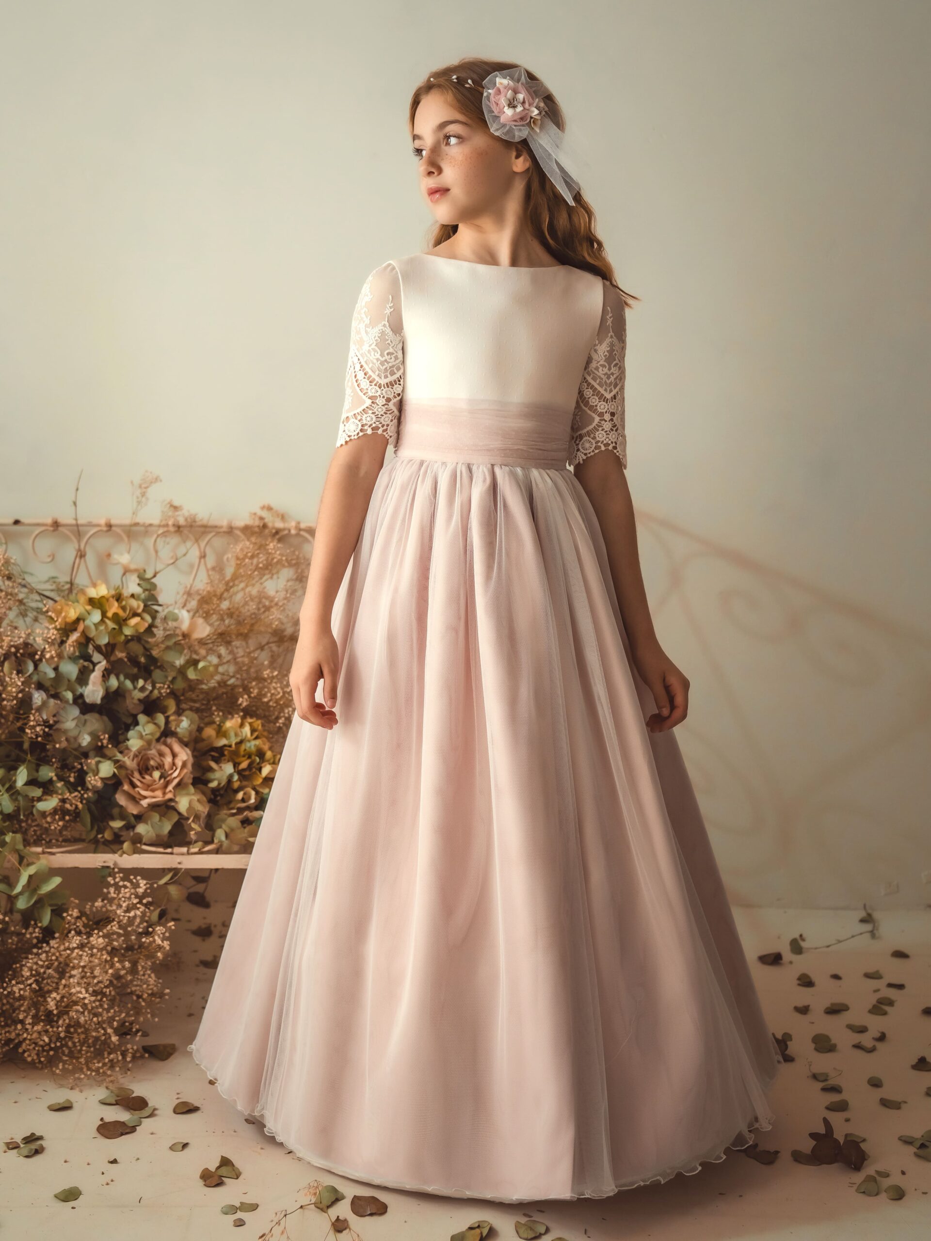 Vestido de comunión sofisticado con cuerpo liso en tono marfil y mangas francesas de encaje. La falda amplia en rosa empolvado y el cinturón a juego realzan la elegancia del diseño