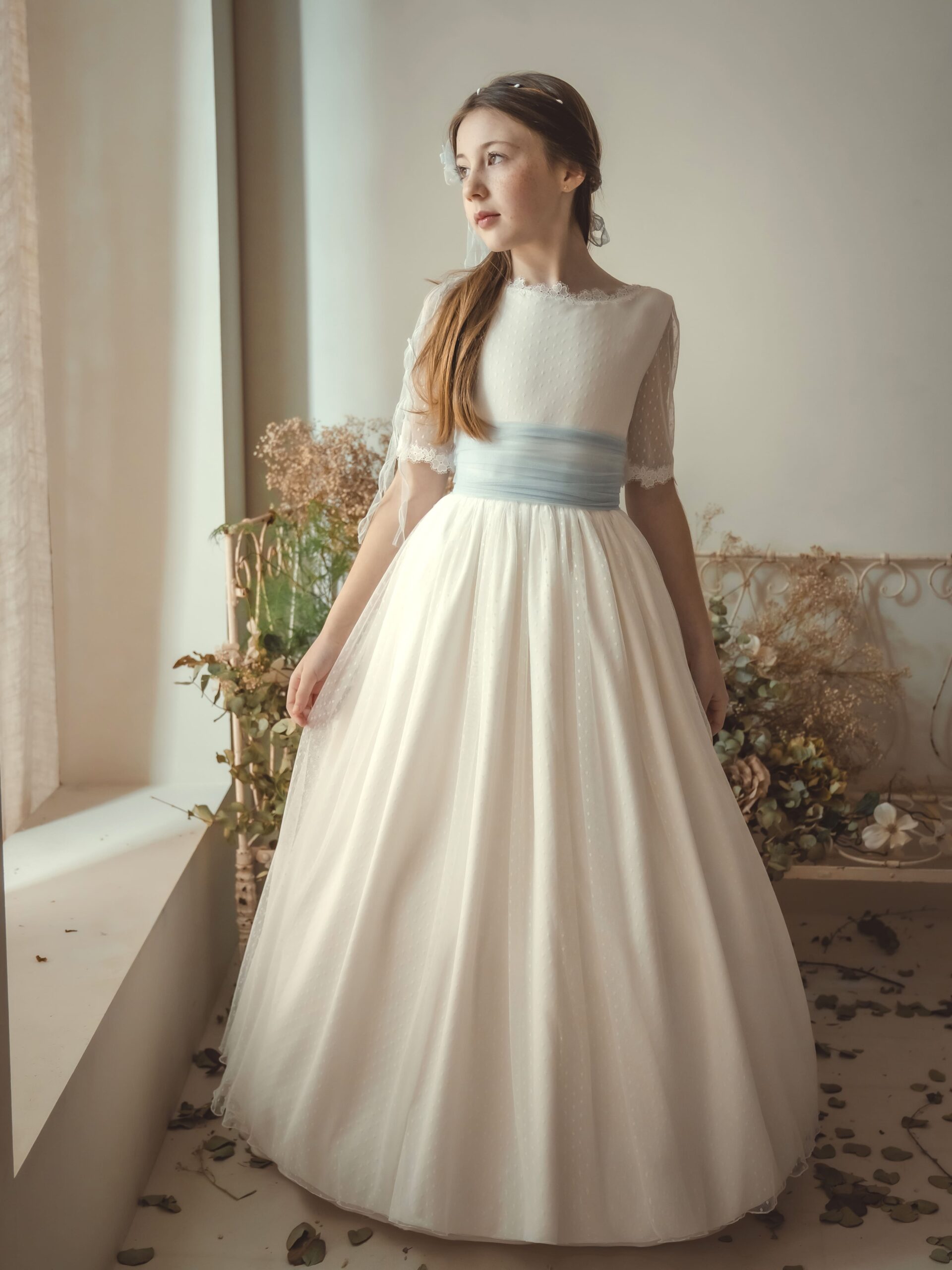 Vestido de comunión refinado con cuerpo en plumeti y delicadas mangas francesas semitransparentes. La falda amplia en tul ligero aporta movimiento y elegancia, mientras que el cinturón azul celeste aporta un contraste fresco y sofisticado.