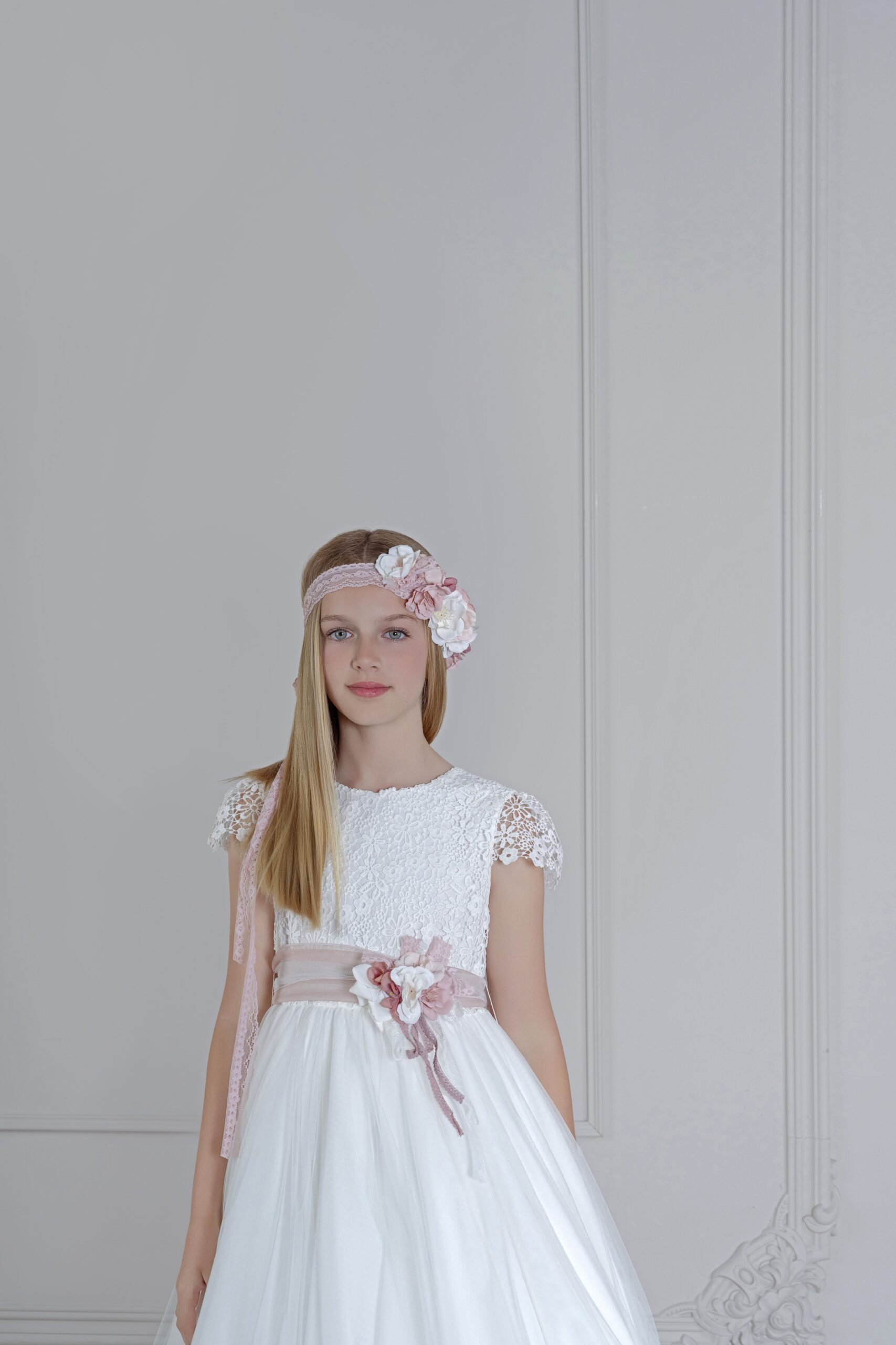 Vestido de comunión en tejido vaporoso con delicadas mangas de encaje y falda de gran volumen. Su cinturón con lazo de organza rosa y aplicaciones florales