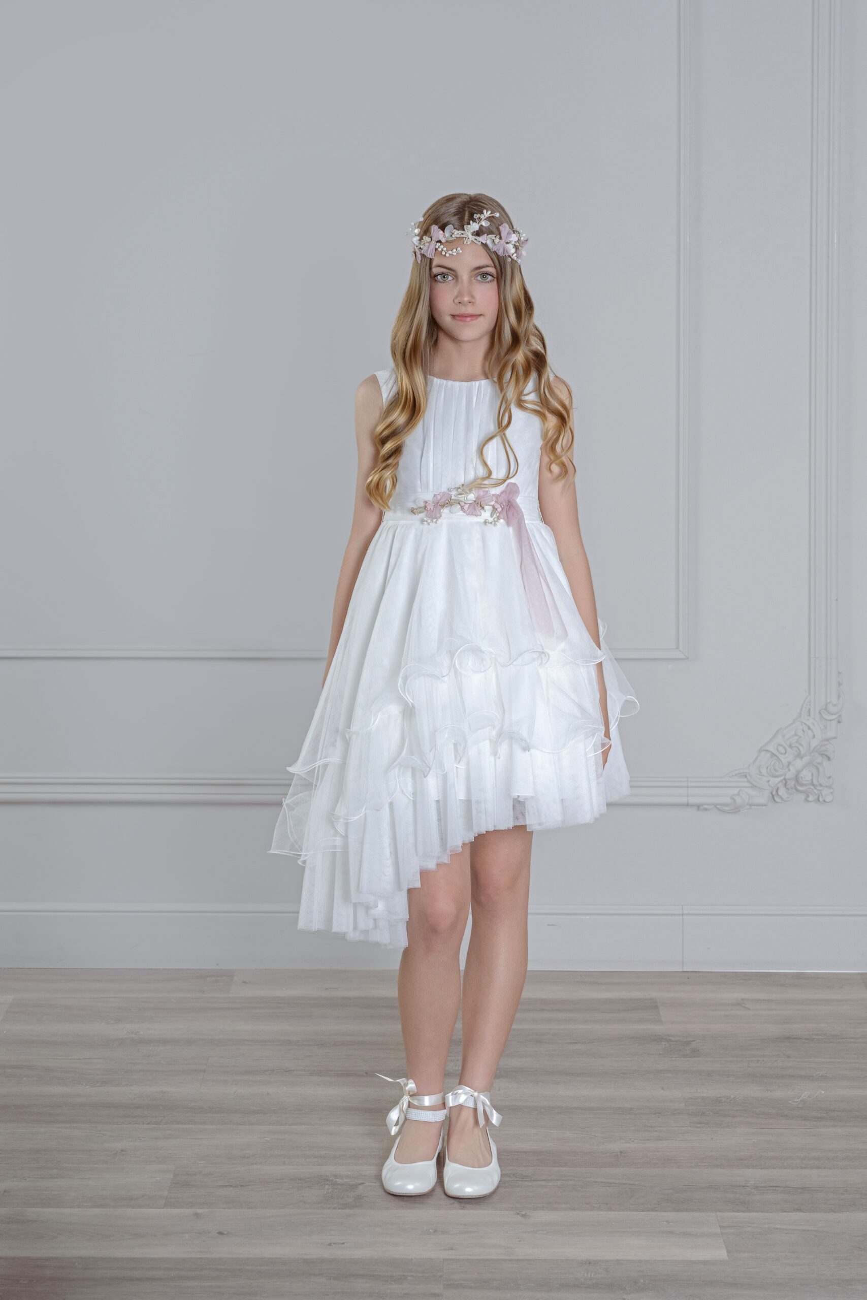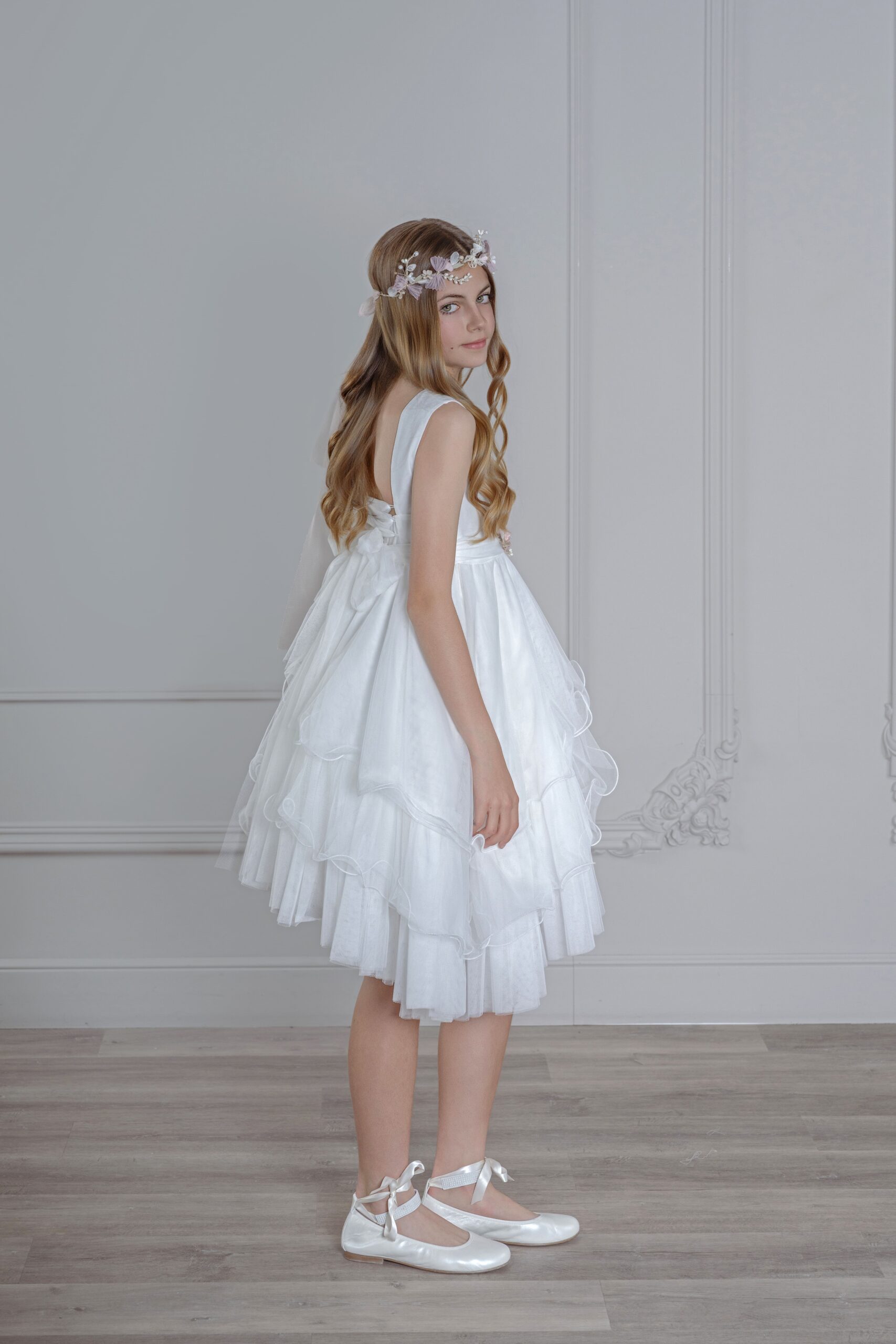 Elegante vestido de comunión corto con falda de volantes en capas y escote en la espalda. Su diseño fresco y juvenil, acompañado de una delicada corona floral, aporta un estilo moderno y desenfadado para un día especial.