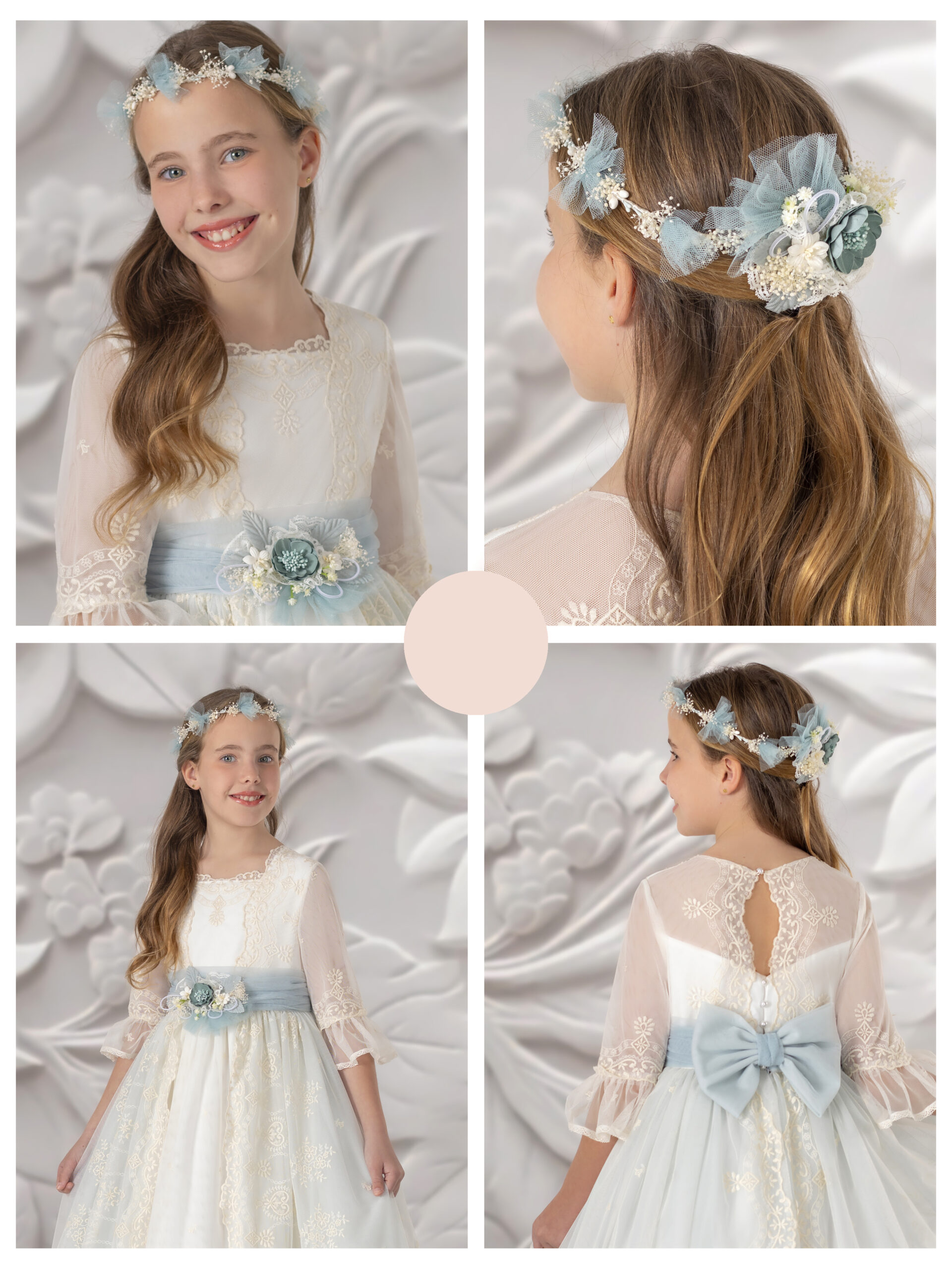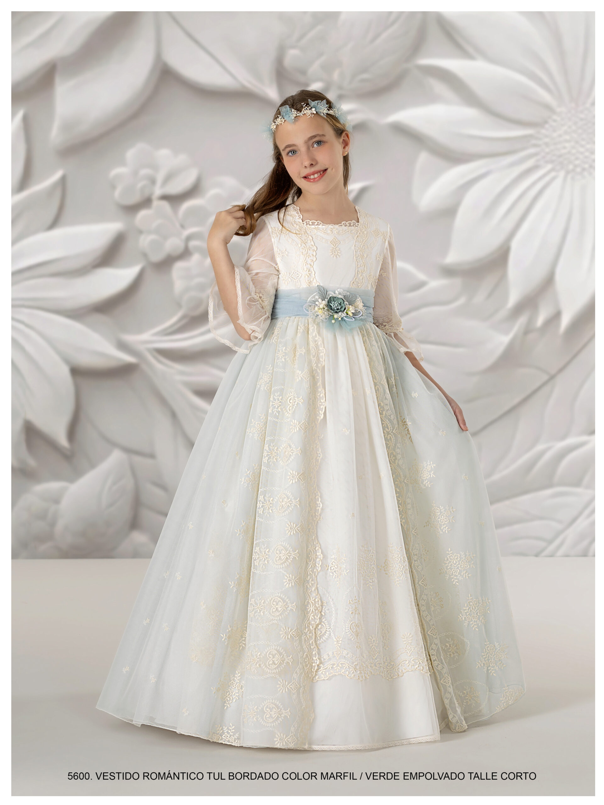 Este vestido de comunión presenta un diseño romántico y encantador, confeccionado en tul bordado en un delicado color marfil. La parte superior tiene un escote cuadrado y mangas al codo de tul que aportan un aire etéreo. La cintura está adornada con un fajín de color verde empolvado, que se complementa con una flor decorativa, añadiendo un toque de frescura. La falda es amplia y fluida, permitiendo un movimiento elegante, ideal para una ocasion tan importante.