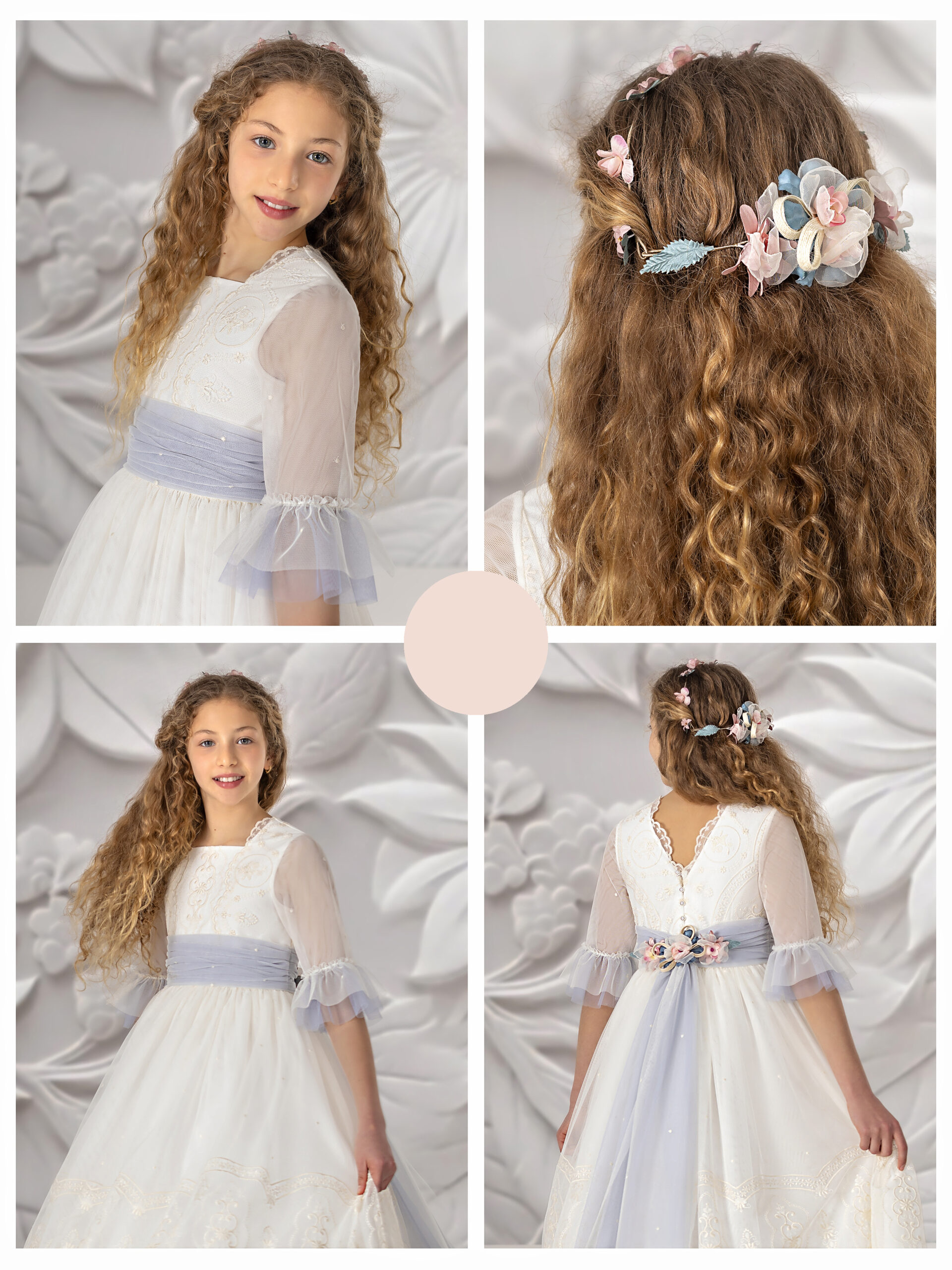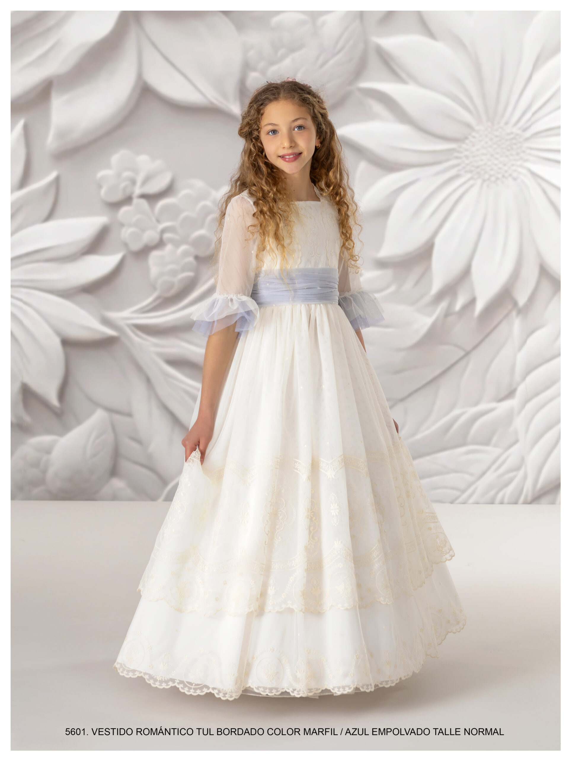 Vestido de comunión, cuenta con un fajín de color azul empolvado en la cintura. La parte superior también tiene un diseño de tul bordado en color marfil, con mangas al codo que aportan un toque romántico. La falda, amplia y con un acabado delicado, permite una gran libertad de movimiento, haciendo de este vestido una opción perfecta para el día de su comunión.