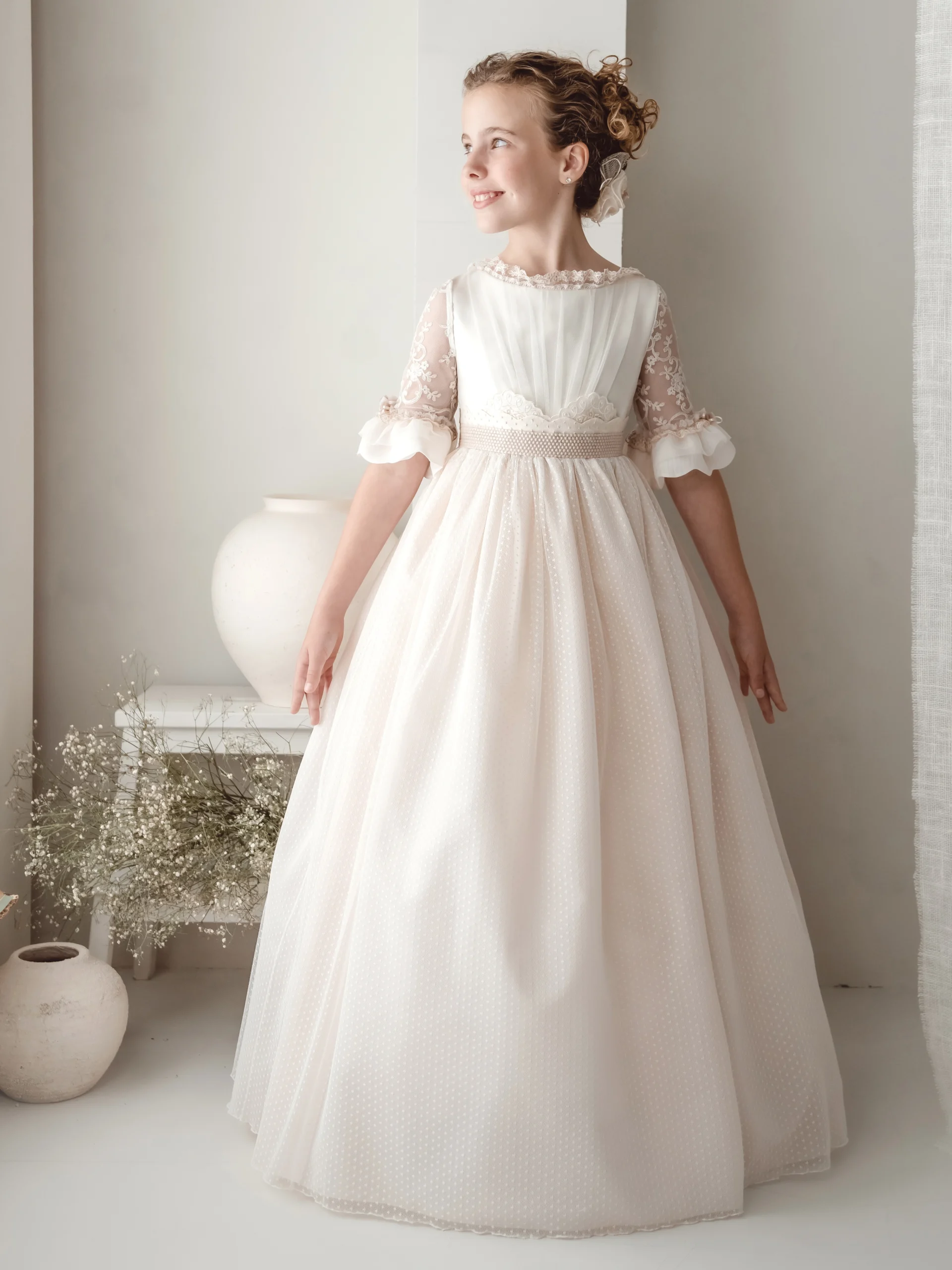 Vestido de comunión en tonos marfil con cuerpo plisado y mangas de encaje con detalles florales. La cintura está decorada con un fajín beige y un delicado lazo. La falda amplia de tul vaporoso aporta movimiento y elegancia, creando un estilo clásico y encantador.