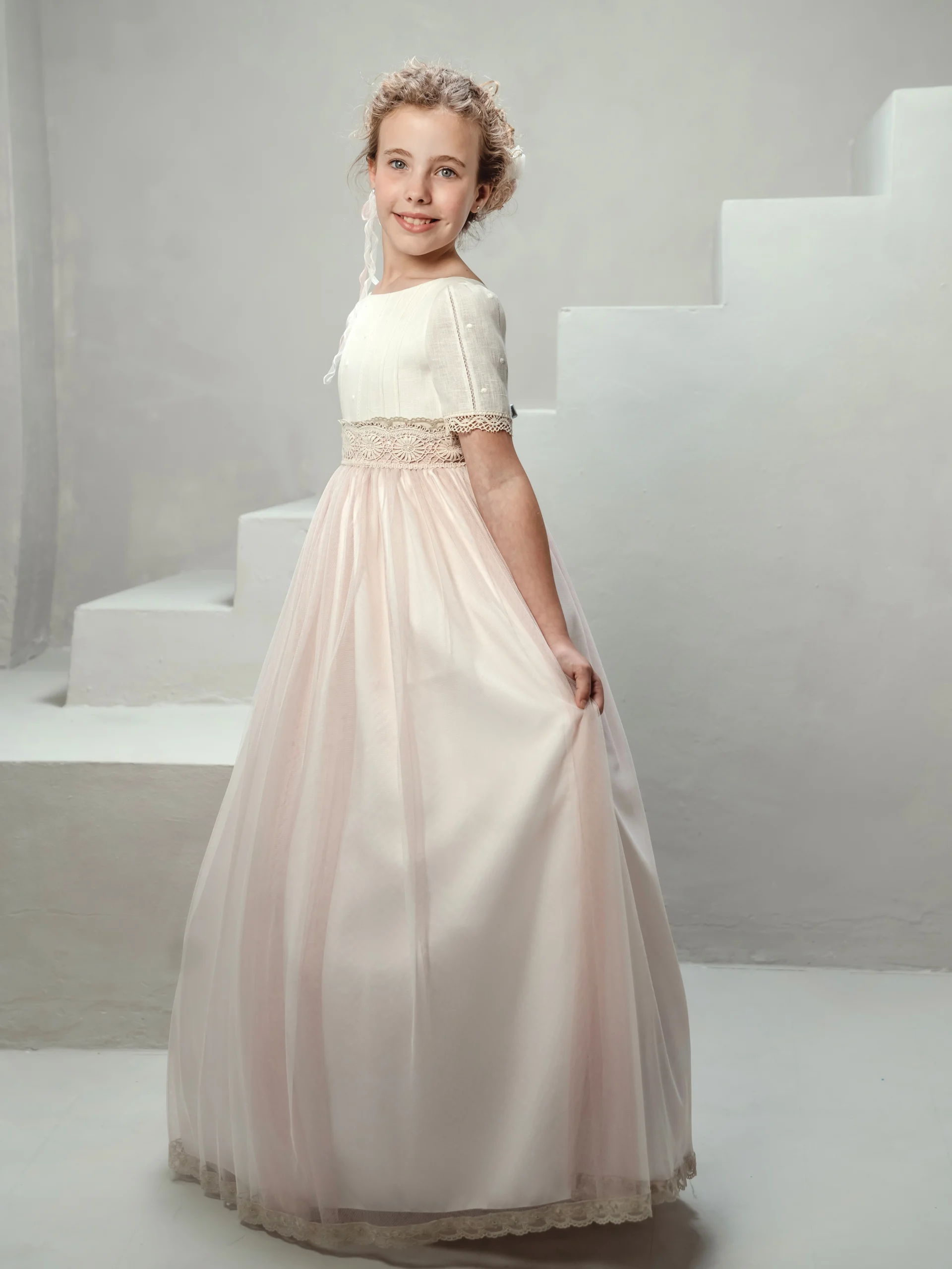 Vestido de comunión en tonos marfil con cuerpo liso y mangas de tul decoradas con lunares delicados. El fajín rosa claro en la cintura añade un toque de color, mientras que la falda de tul vaporoso crea un estilo etéreo y elegante.