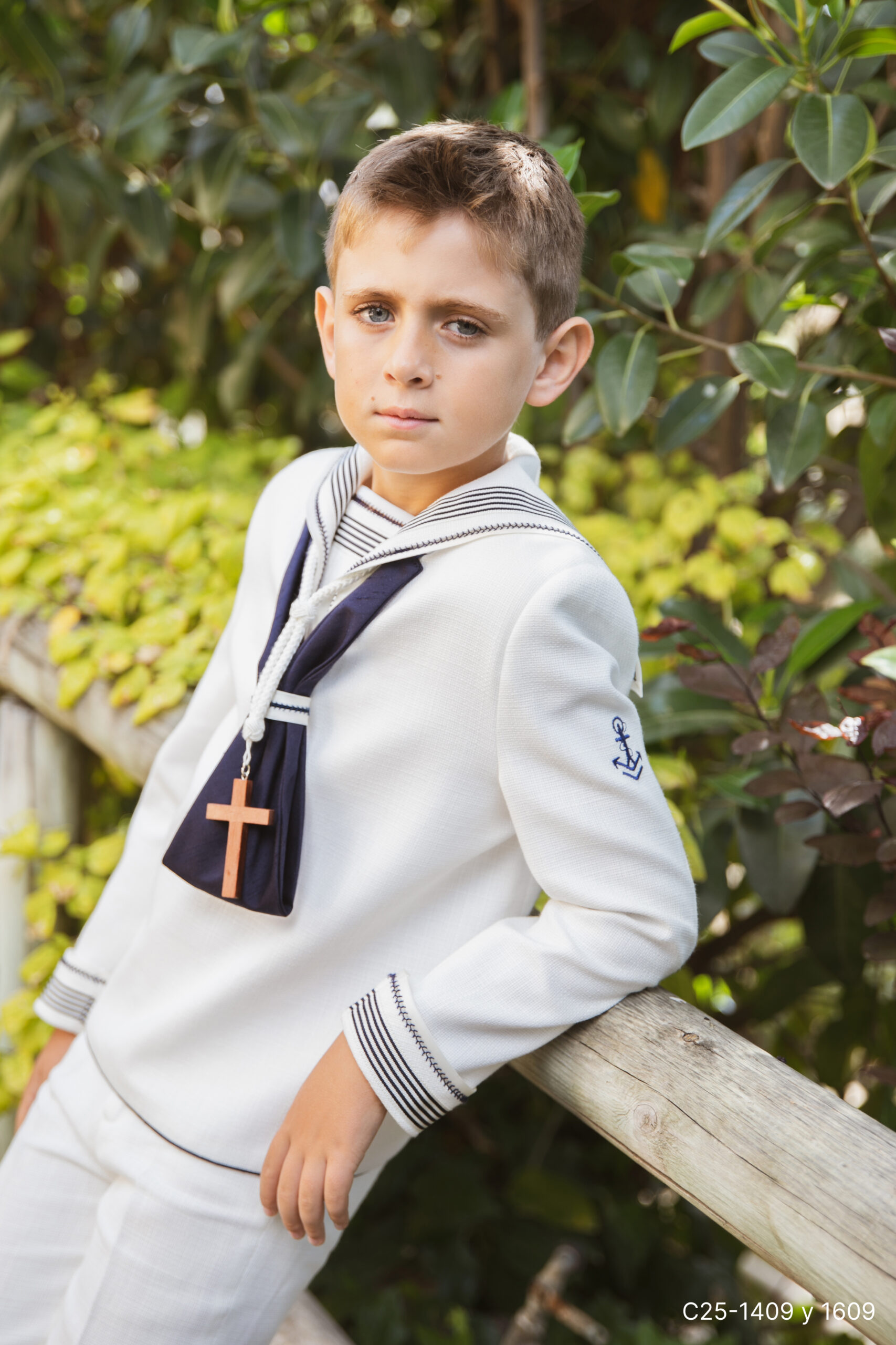 Traje de comunión de marinero en color blanco con detalles en azul marino en el cuello y puños. La casaca está decorada con un pañuelo oscuro y un crucifijo de madera, aportando un estilo tradicional con un toque formal.