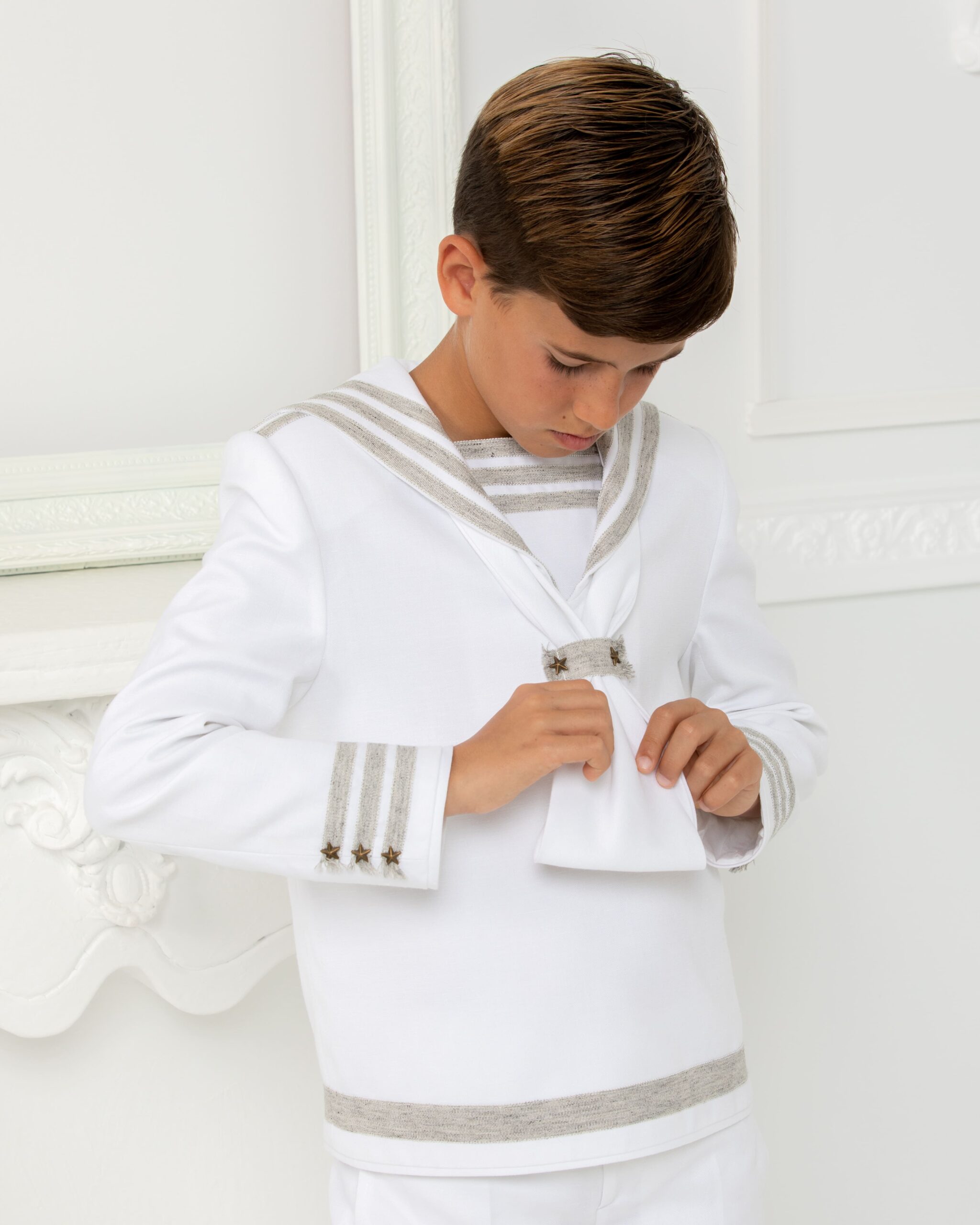 Este traje marinero en blanco puro destaca por sus detalles en lino natural en cuello, bajo y puños, realzados con pequeñas estrellas bordadas.