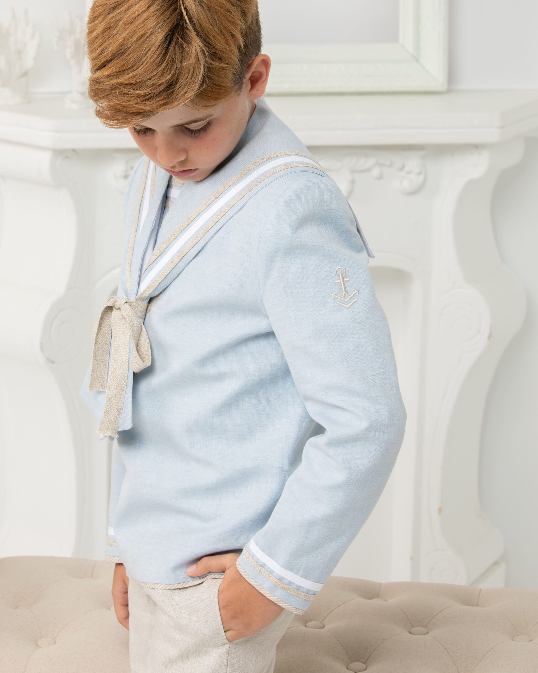 Traje marinero en tono celeste claro combina la tradición con un aire contemporáneo. Sus detalles en lino natural, presentes en el cuello, puños y lazada, junto con el bordado de ancla en la manga.
