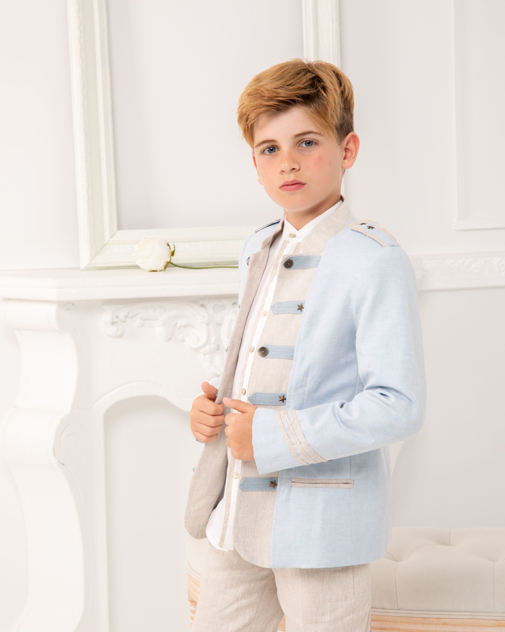 Elegante traje de comunión compuesto por levita azul cielo con detalles en beige, camisa blanca con cuello mao y pantalón en lino natural. Un diseño sofisticado y moderno que aporta frescura