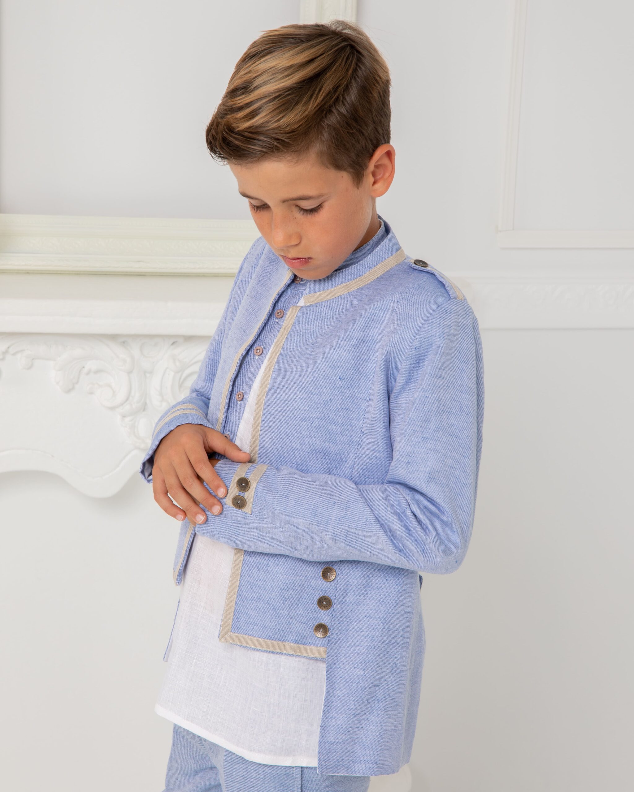 Un conjunto moderno y sofisticado en tono azul claro, realzado con vivos en beige que aportan elegancia y frescura. La levita destaca por su diseño entallado con botonadura decorativa, combinada con camisa blanca ligera y pantalón a juego.