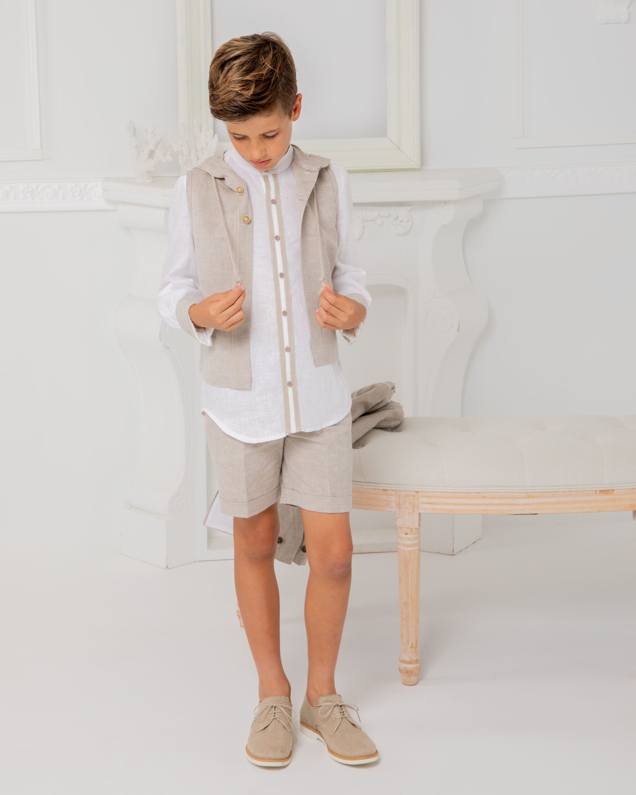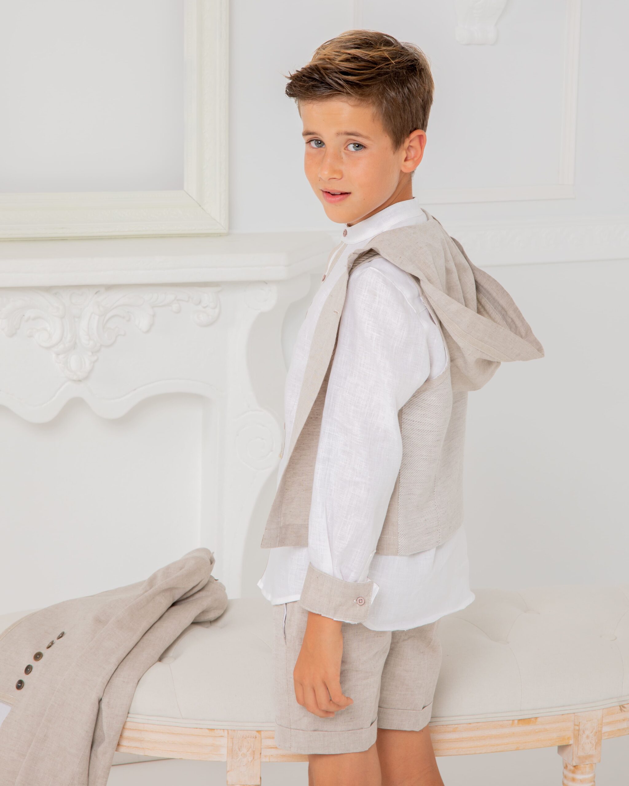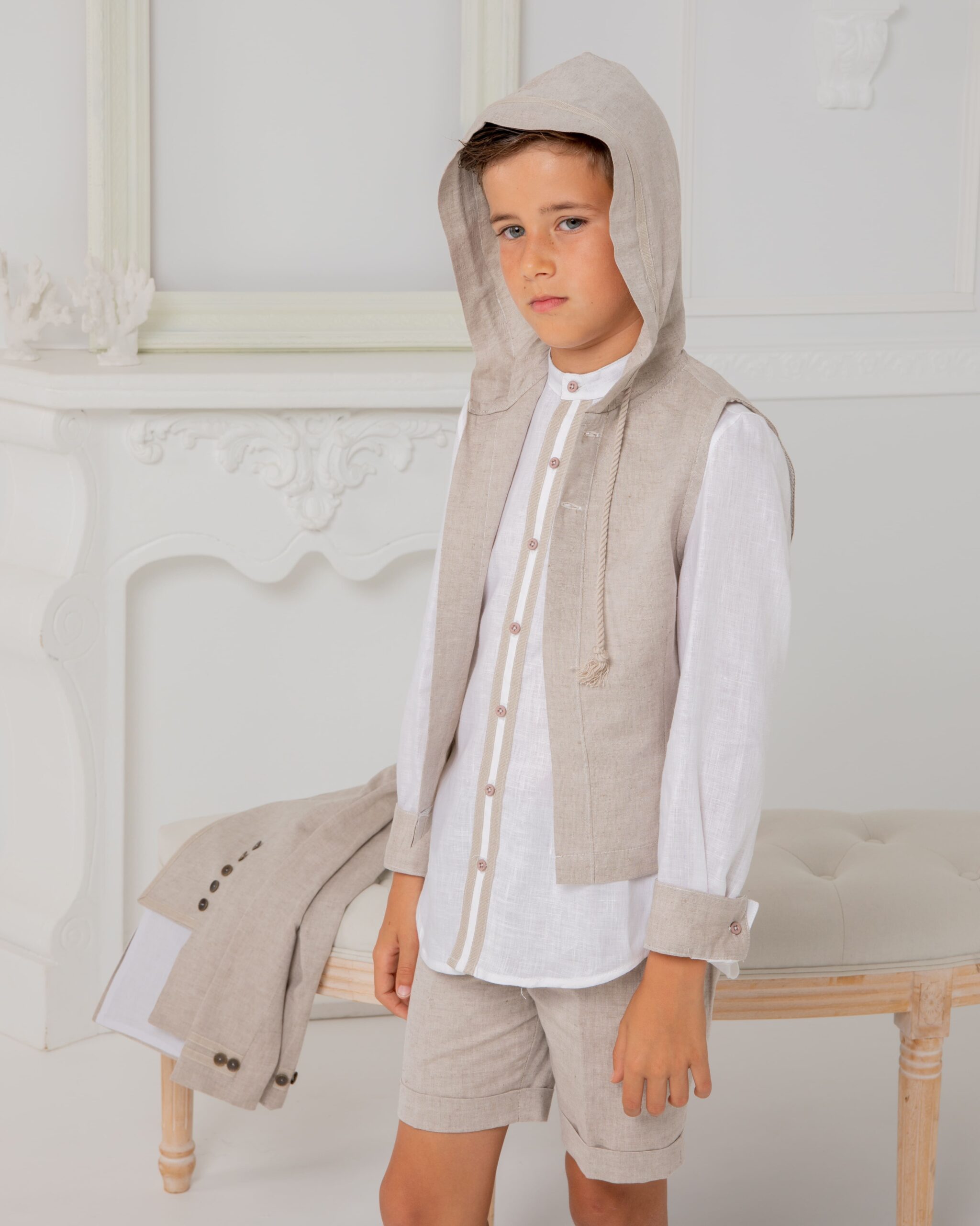 Conjunto fresco y elegante compuesto por camisa de lino blanca, chaleco con capucha en tono crudo y bermuda a juego. Una propuesta ligera y cómoda que combina sencillez y estilo