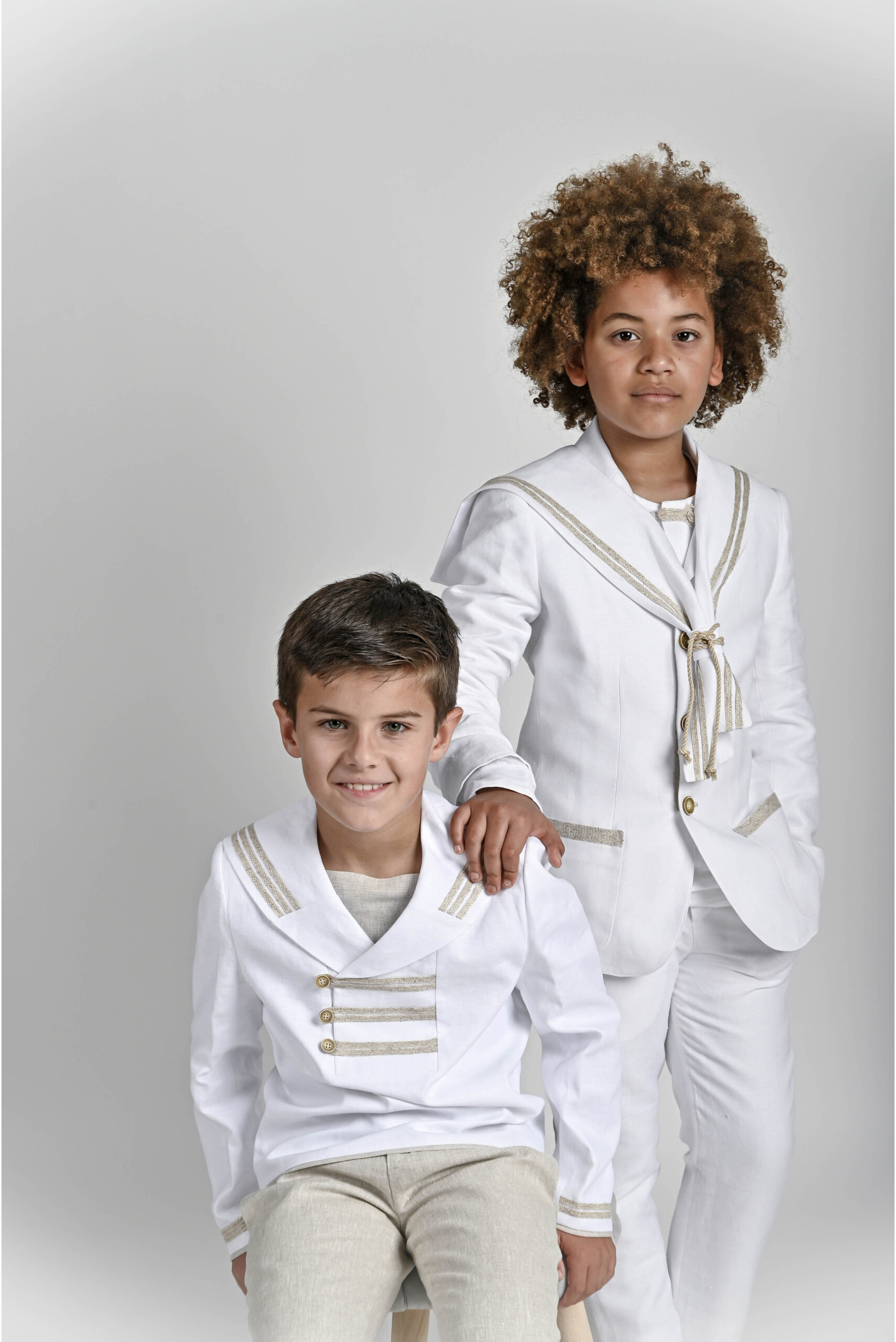 Conjuntos frescos y elegantes en lino blanco con galones y detalles en tono arena. Estilo clásico renovado con chaqueta o blusón marinero, perfectos para comuniones con aire natural y sofisticado.