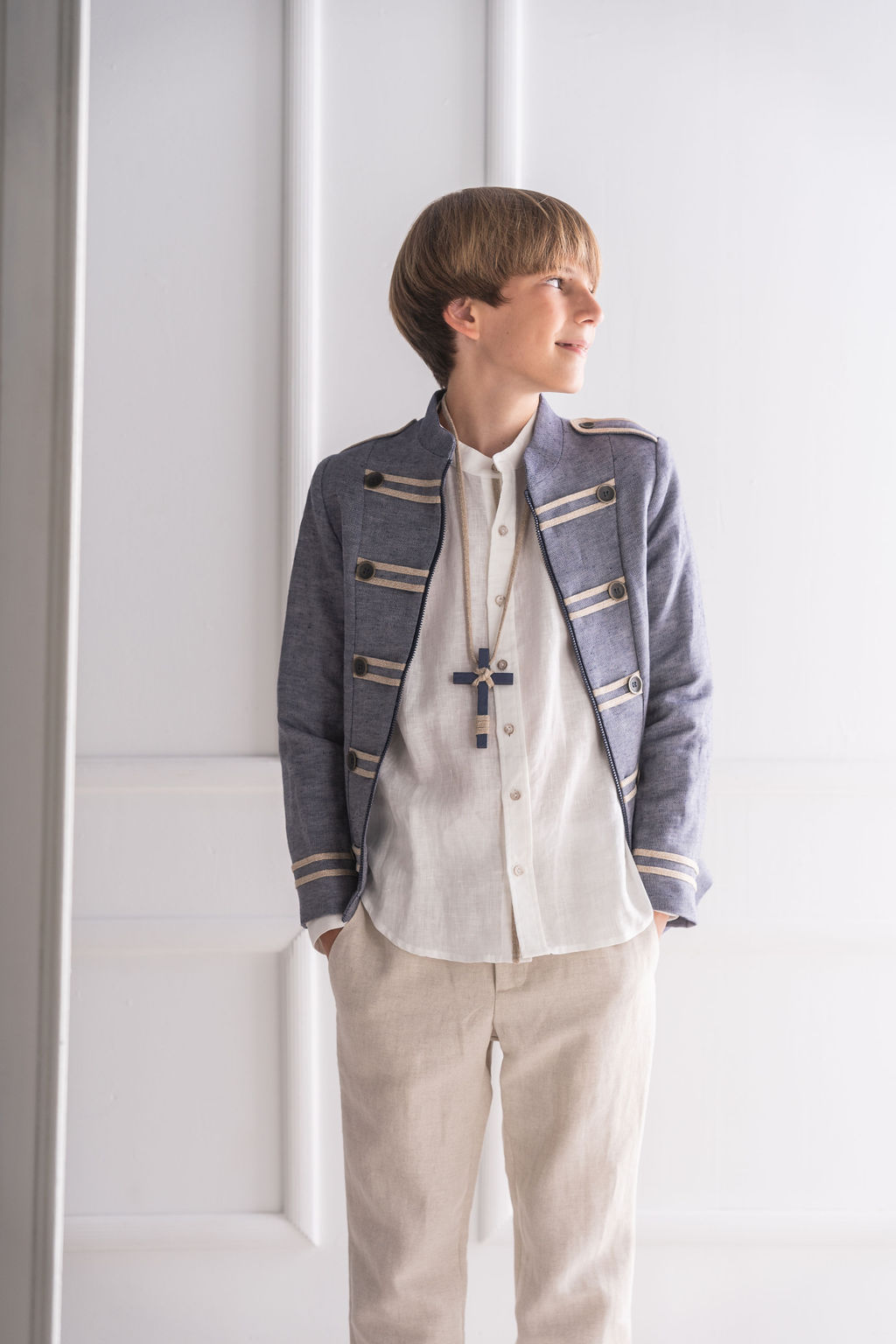 Traje de comunión estilo almirante en lino. Americana azul con detalles dorados, camisa de lino blanca y pantalón beige. Diseño cómodo, elegante y moderno. Ideal para comuniones primaverales.