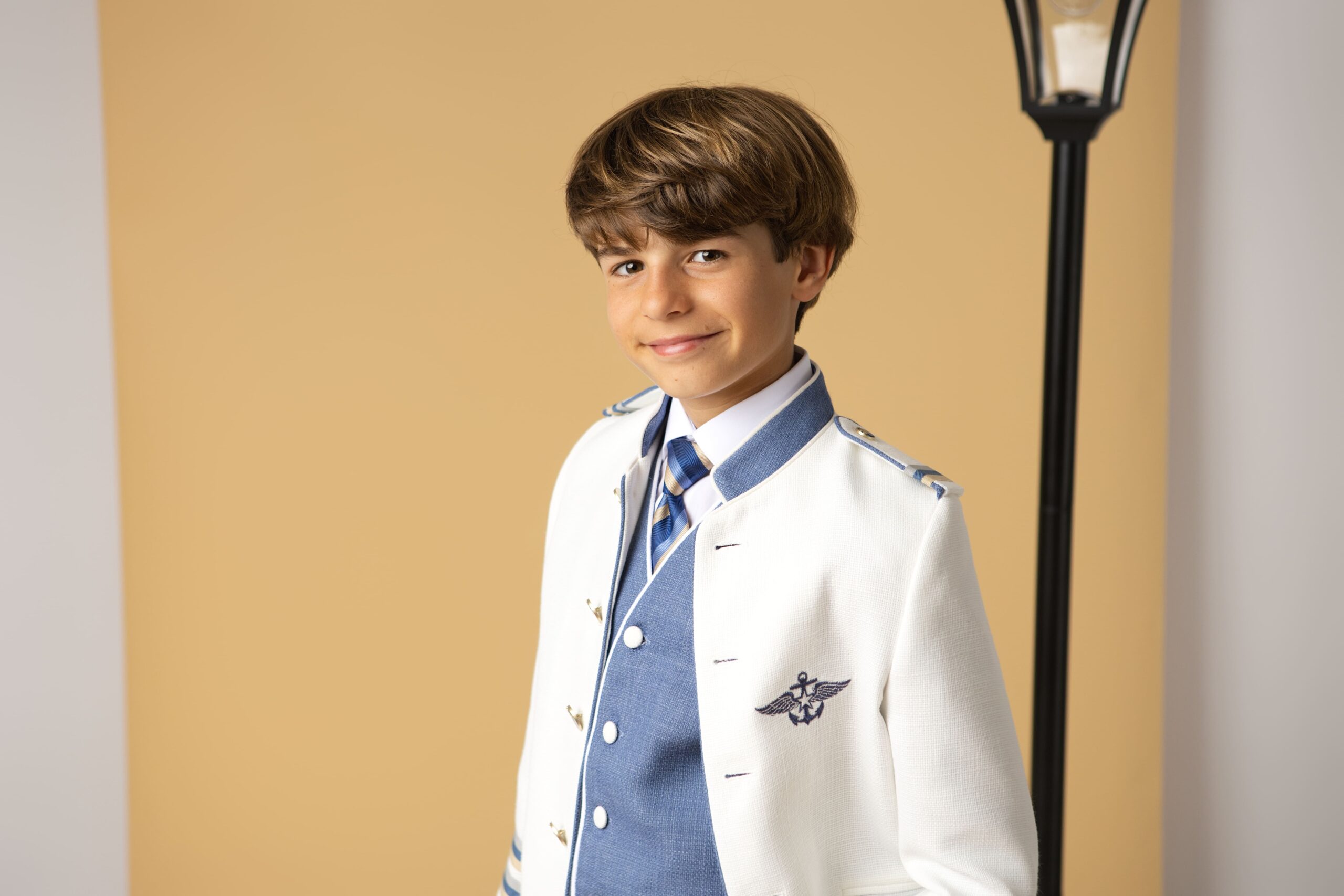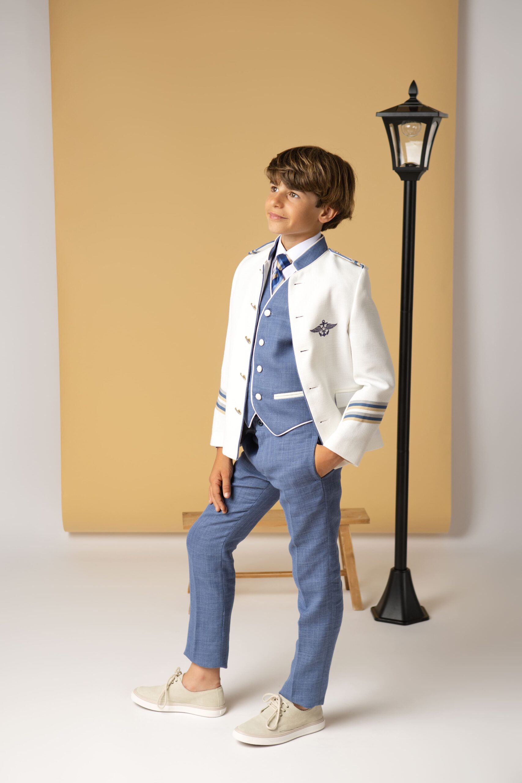 Elegante traje de comunión estilo marinero en blanco con detalles azul cielo. Incluye chaqueta blanca con insignia bordada, chaleco y pantalón azul, además de corbata a rayas.