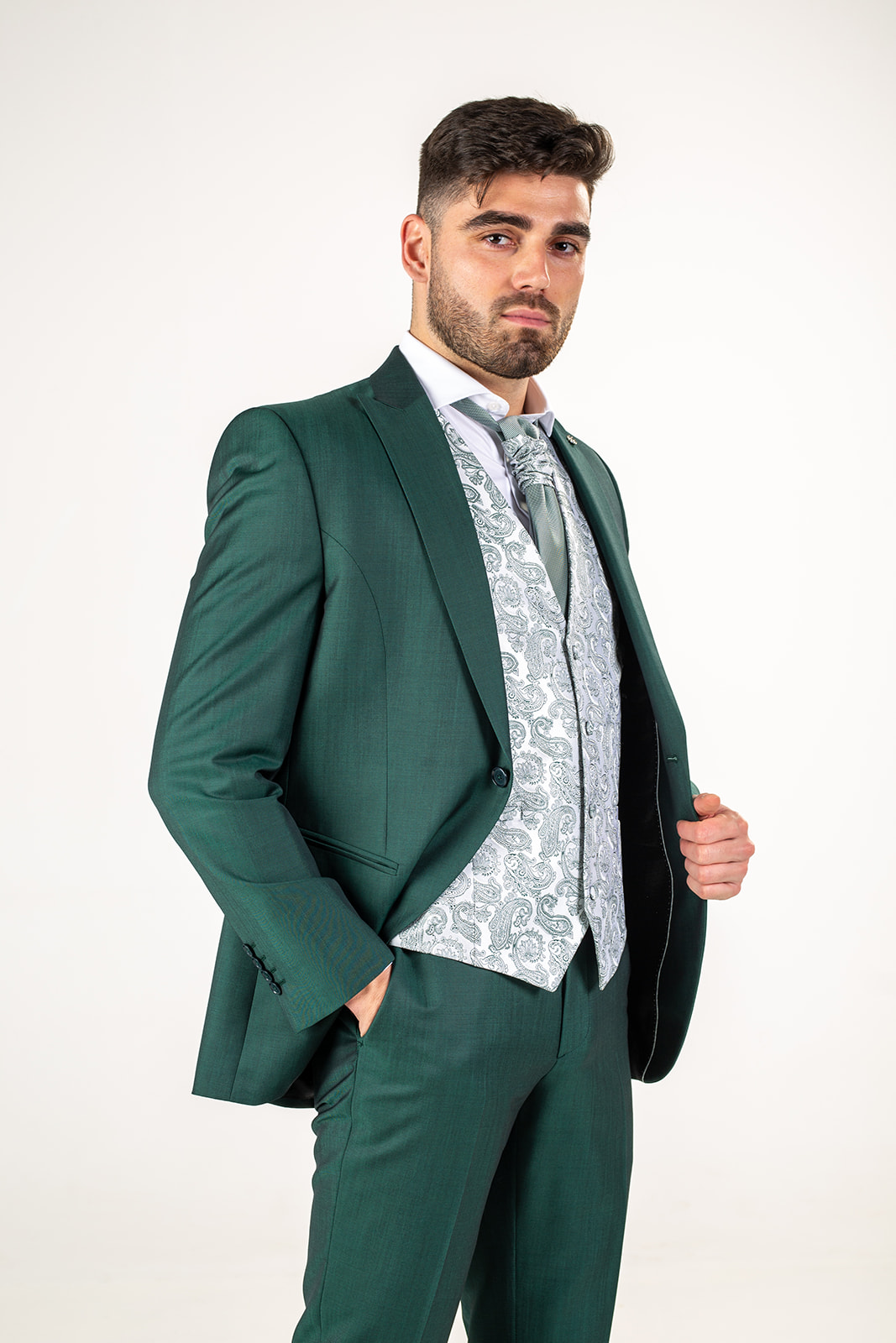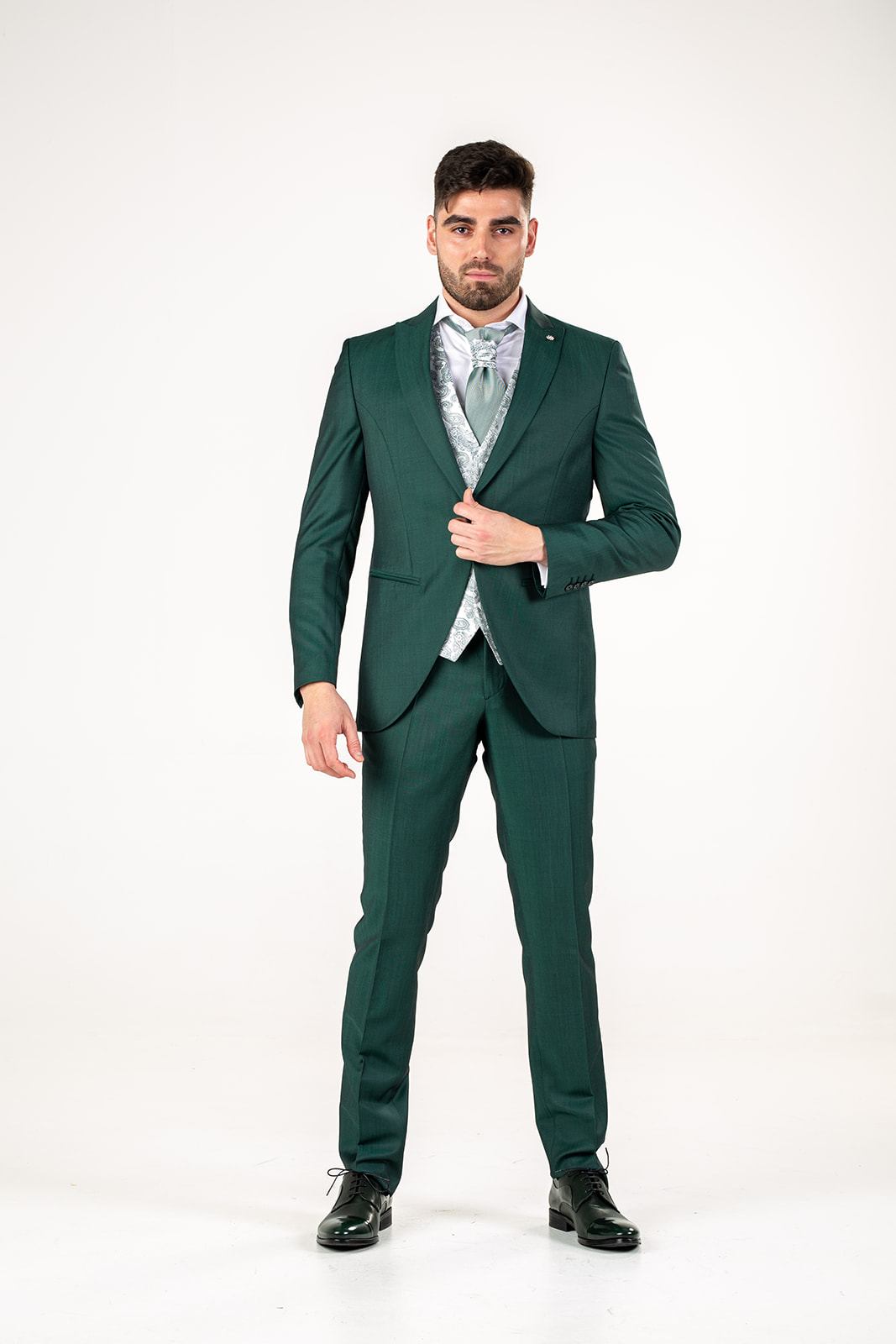 Traje en color verde, perfecto para un invitado especial, combinado con un coordinado de cashmere en tonos verdes y fondo plata, dando luz al traje.