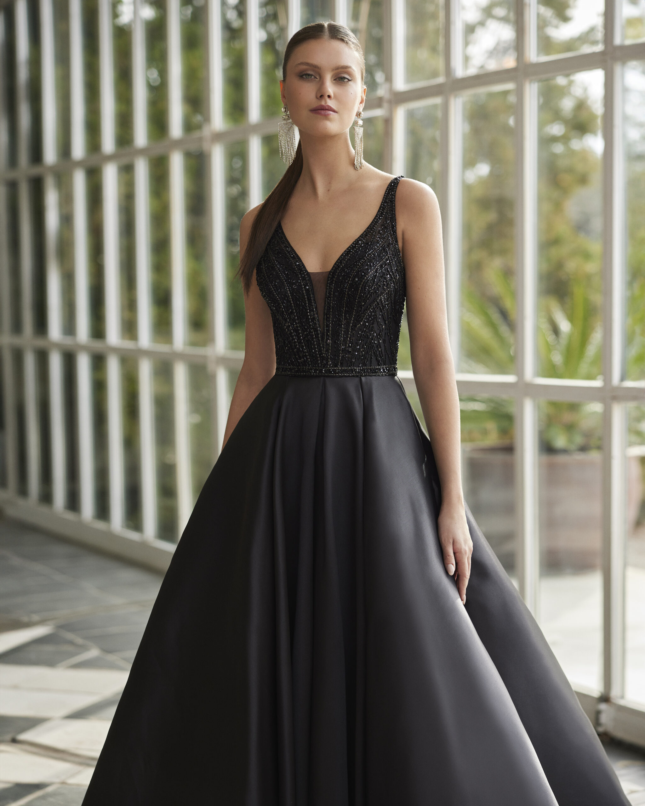 Vestido de fiesta largo. Confeccionado en mikado combinado con pedrería. Con escote y espalda en v y tirantes Falda con bolsillos.