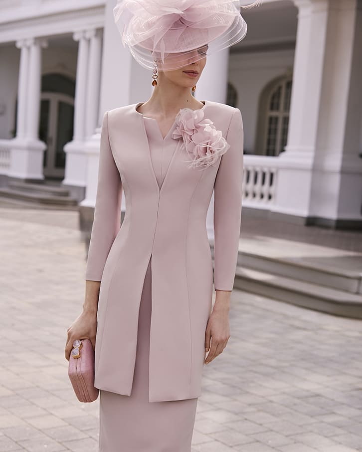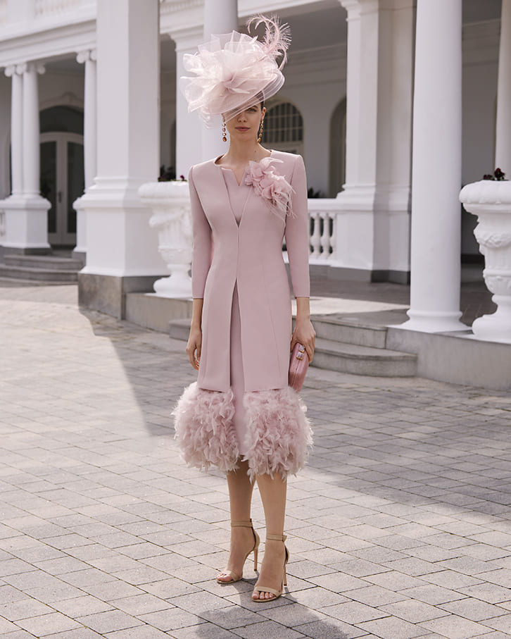 Vestido midi en tono rosa empolvado con corte recto y escote discreto, adornado con una delicada flor en el hombro. Su diseño estructurado se combina con un bajo espectacular de plumas que aporta volumen y movimiento