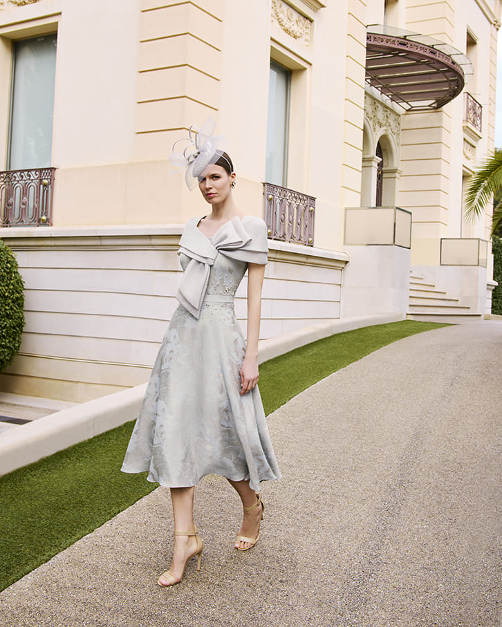 Vestido en tono gris plata destaca por su original lazo XL en el escote, aportando un aire moderno y distinguido. Su falda midi con vuelo, confeccionada en tejido jacquard con sutiles brillos