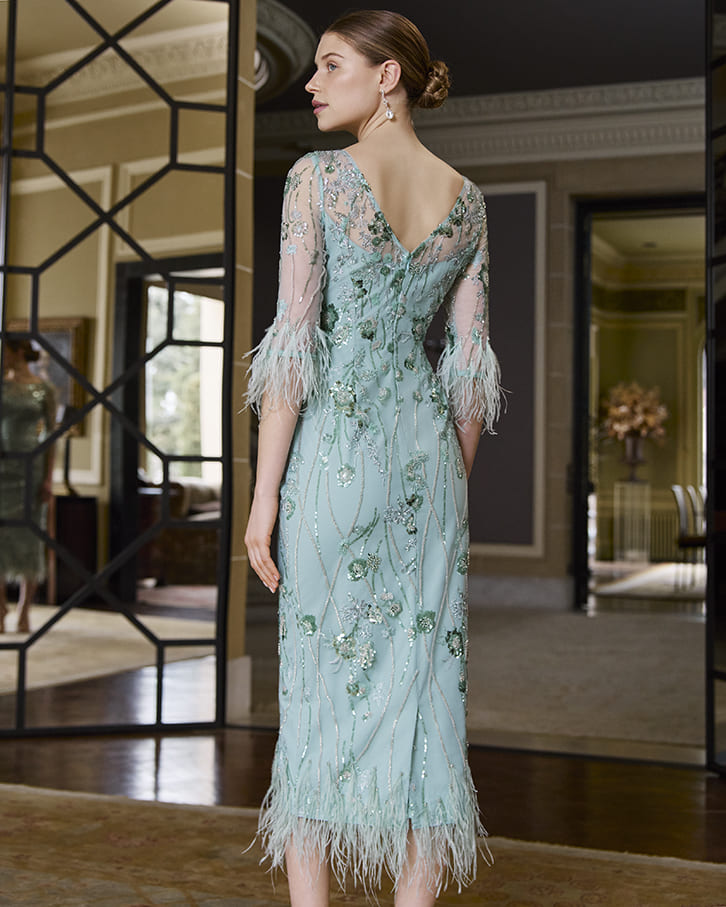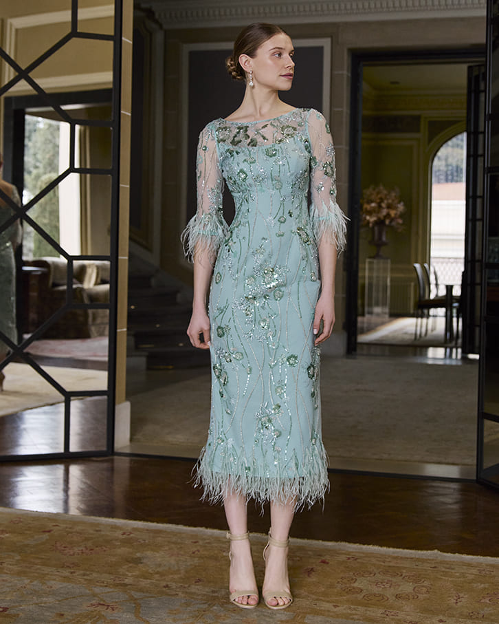 Vestido de fiesta en tono verde agua con silueta entallada y largo midi. El diseño destaca por su delicado bordado con pedrería y aplicaciones florales en todo el cuerpo, aportando brillo y sofisticación.