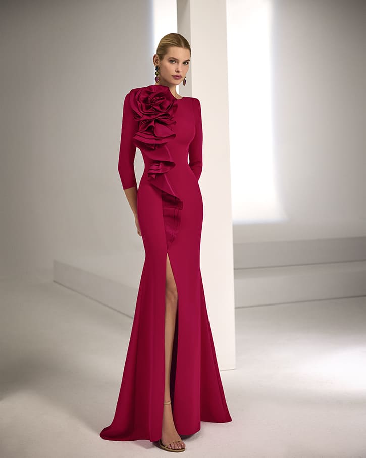 Vestido largo en tono buganvilla intenso, diseñado para acaparar todas las miradas. Su silueta entallada estiliza la figura, mientras que la aplicación floral tridimensional en el hombro y el cuerpo aporta volumen